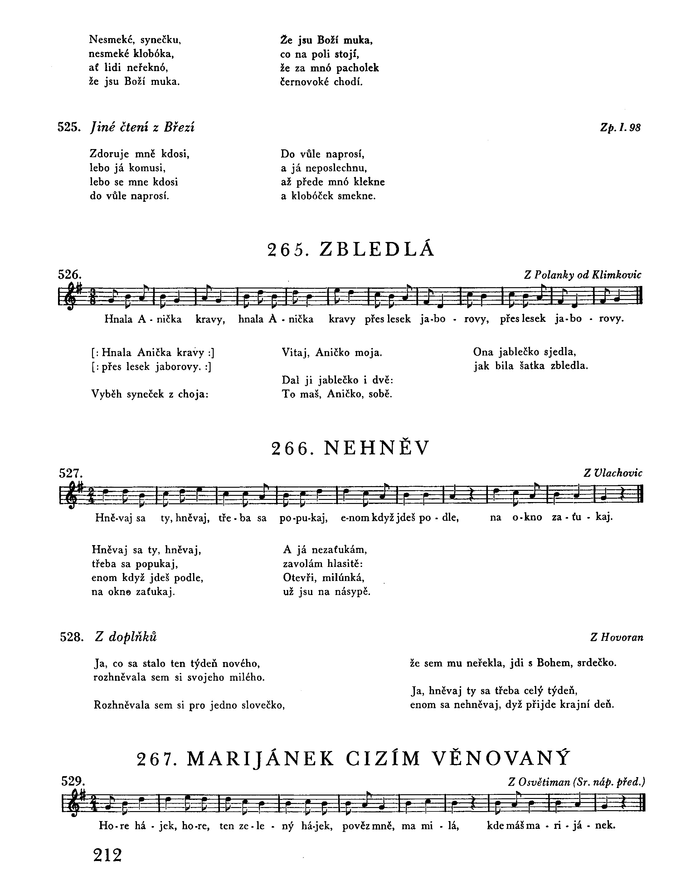 [: Dy sem ja šel přes ten hajek, :] [: zavoněl mi marijanek. :] Marianek najdrobnějši, buděš moja, najmilejši. Marijanek, drobne kviti, poď mne, mila, sprovoditi. Jak tě ja mam sprovoditi, dy už lide všadě sviti? Su tu lide nic dobreho, vysměju se z chudobneho.