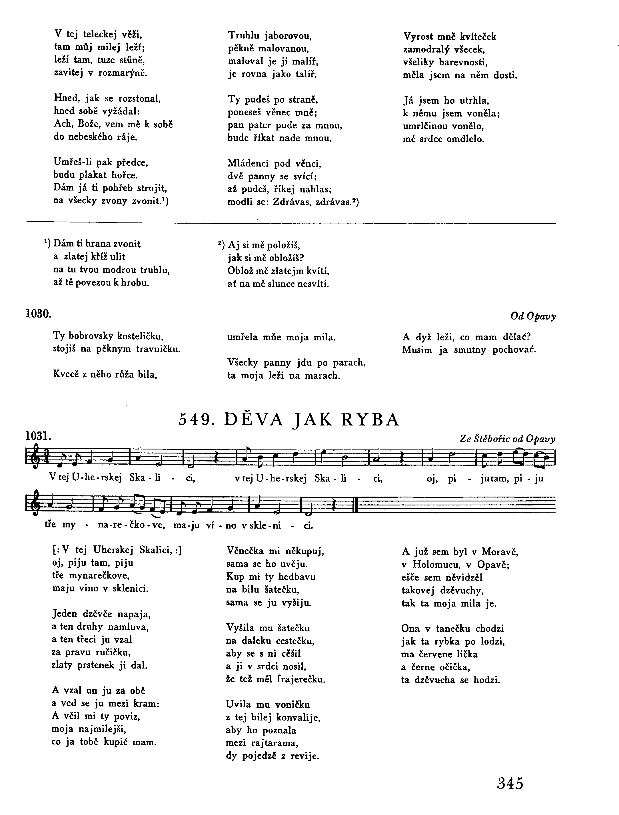 [: U me matky na dolině :] prokvetala konvalije. Trhala ju Majdalenka, Majdalenka ctna panenka. O, ma mila Majdalenko, daj mi jednu konvalinku. A ja ci ji něsmim daci, lala by mi moja maci. Dy ci budzě mama laci, přidź se ke mně litovaci. Mama laje, poličkuje, můj mily mne nělituje.