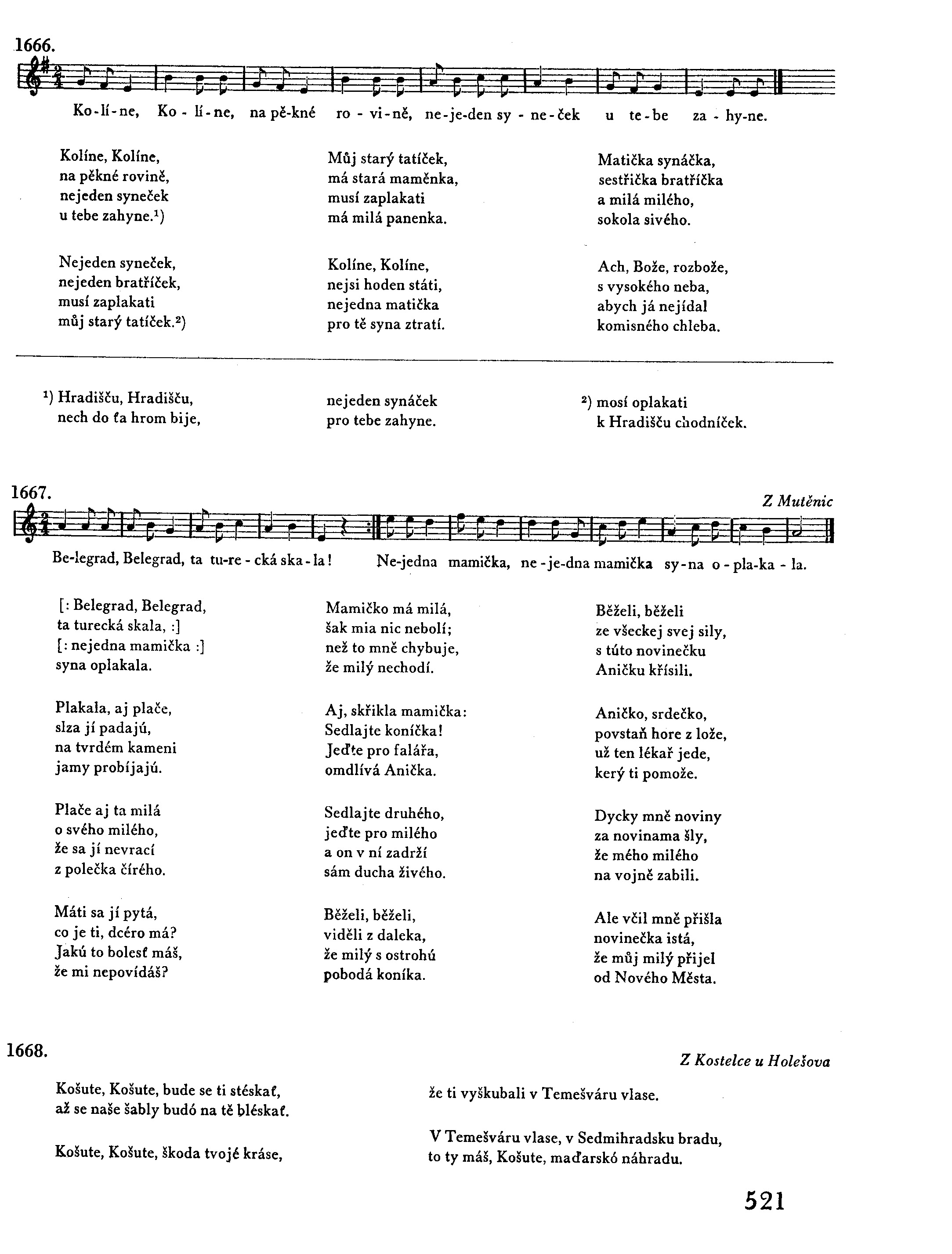 Kolíne, Kolíne, na pěkné rovině, nejeden syneček u tebe zahyne.1) Nejeden syneček, nejeden bratříček, musí zaplakati můj starý tatíček.2) Můj starý tatíček, má stará maměnka, musí zaplakati má milá panenka. Kolíne, Kolíne, nejsi hoden státi, nejedna matička pro tě syna ztratí. Matička synáčka, sestřička bratříčka a milá milého, sokola sivého. Ach, Bože, rozbože. s vysokého neba, abych já nejídal komisného chleba.