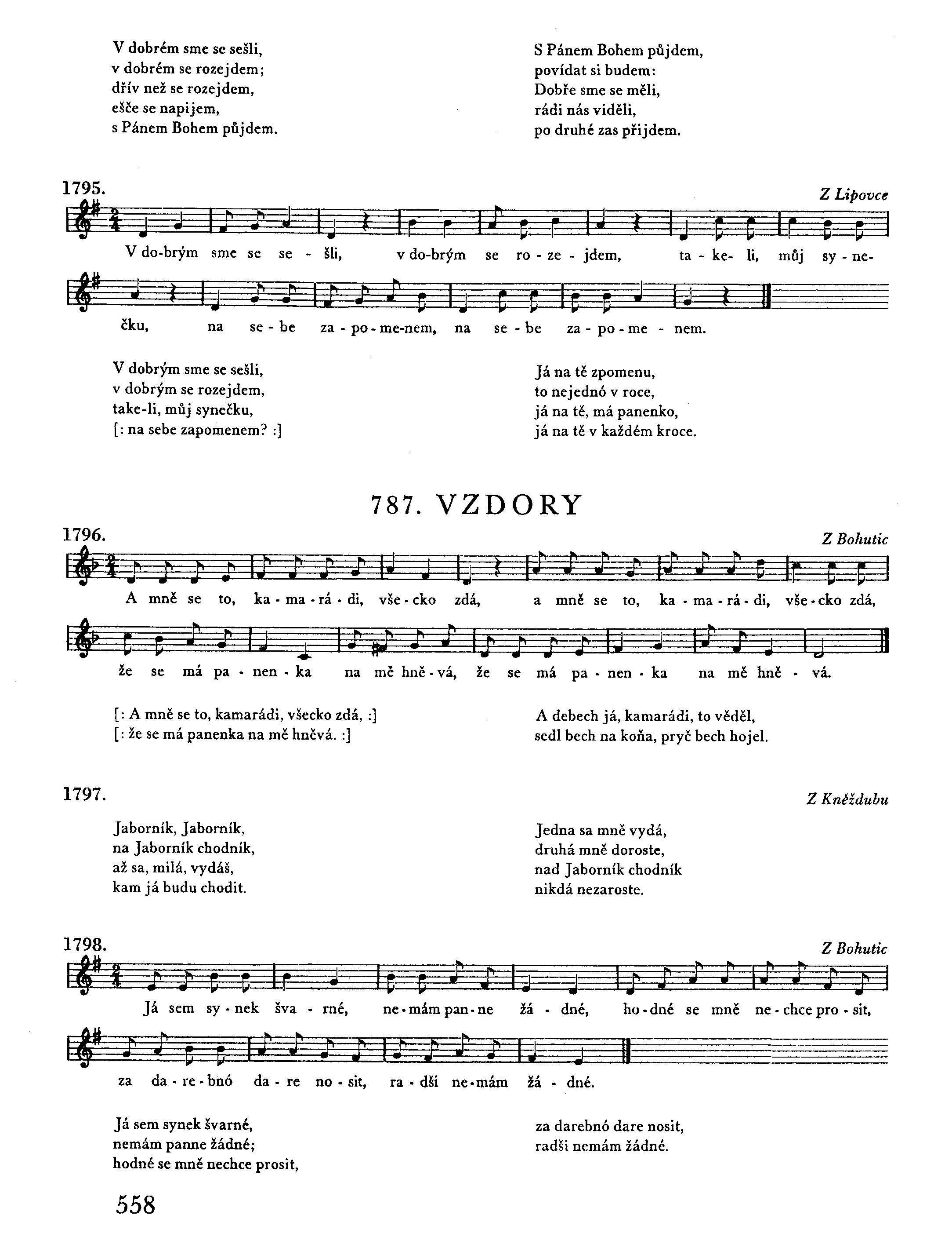 Jak je mně, tak je mně, šak mně dobře néní, když k nám nesmí chodit moje potěšení. Moje potěšení, můj věrný syneček, nesmí on šlapávat k našemu chodníček. Můj starý tatíčku, pro Boha vás prosím, dovolte si mně vzít, co v svém srdci nosím. Sami ste si vzali, co sa vám lúbilo, mně si nedáte vzít, co by mia těšilo. Dolina, dolina, co je po dolině, dyž sa my, šohajku, rozejít musíme. V dobrém sme sa sešli, v dobrém sa rozejdem; kerý na kerého spjéše zapomenem? Já bych zapomněla, dybych jenom chtěla, dybych ťa, šohajku, tak ráda neměla.1) Zapomněla bych já, zapomněla lehce, ale mé srdénko zapomenút nechce.