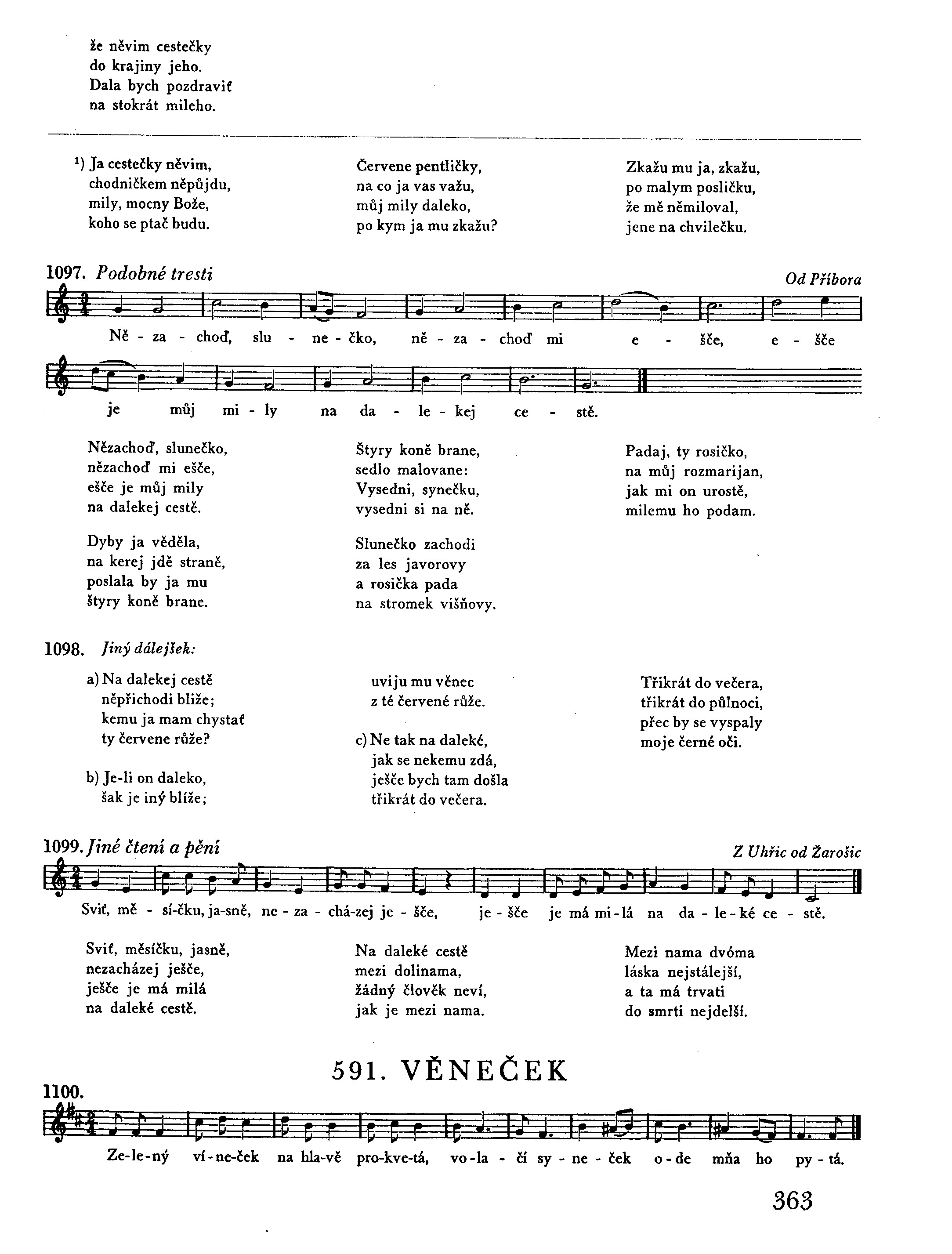 Na dalekej cestě něpřichodi bliže; kemu ja mam chystať ty červene růže? Je-li on daleko, šak je iný blíže; uviju mu věnec z té červené růže. Ne tak na daleké, jak se nekemu zdá, ješče bych tam došla třikrát do večera. Třikrát do večera, třikrát do půlnoci, přec by se vyspaly moje černé oči.