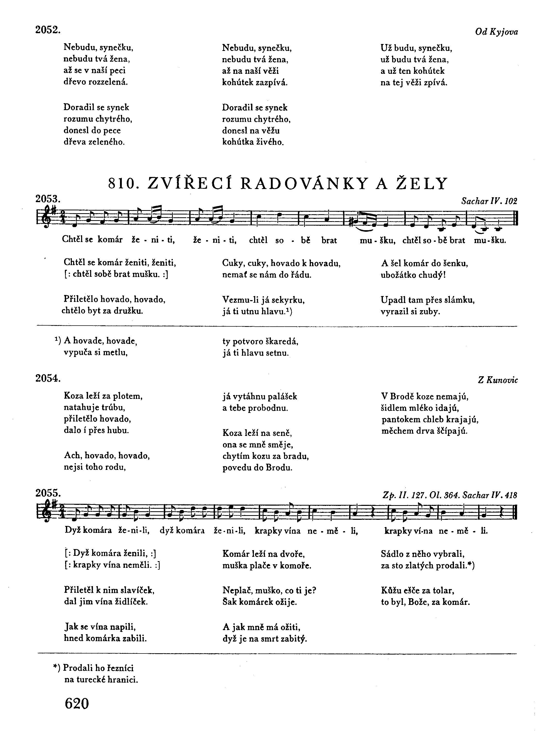 Chtěl se komár ženiti, ženiti, [: chtěl sobě brat mušku. :] Přiletělo hovado, hovado, chtělo byt za družku. Cuky, cuky, hovado k hovadu, nemať se nám do řádu. Vezmu-li já sekyrku, já ti utnu hlavu.1) A šel komár do šenku, ubožátko chudý! Upadl tam přes slámku, vyrazil si zuby.