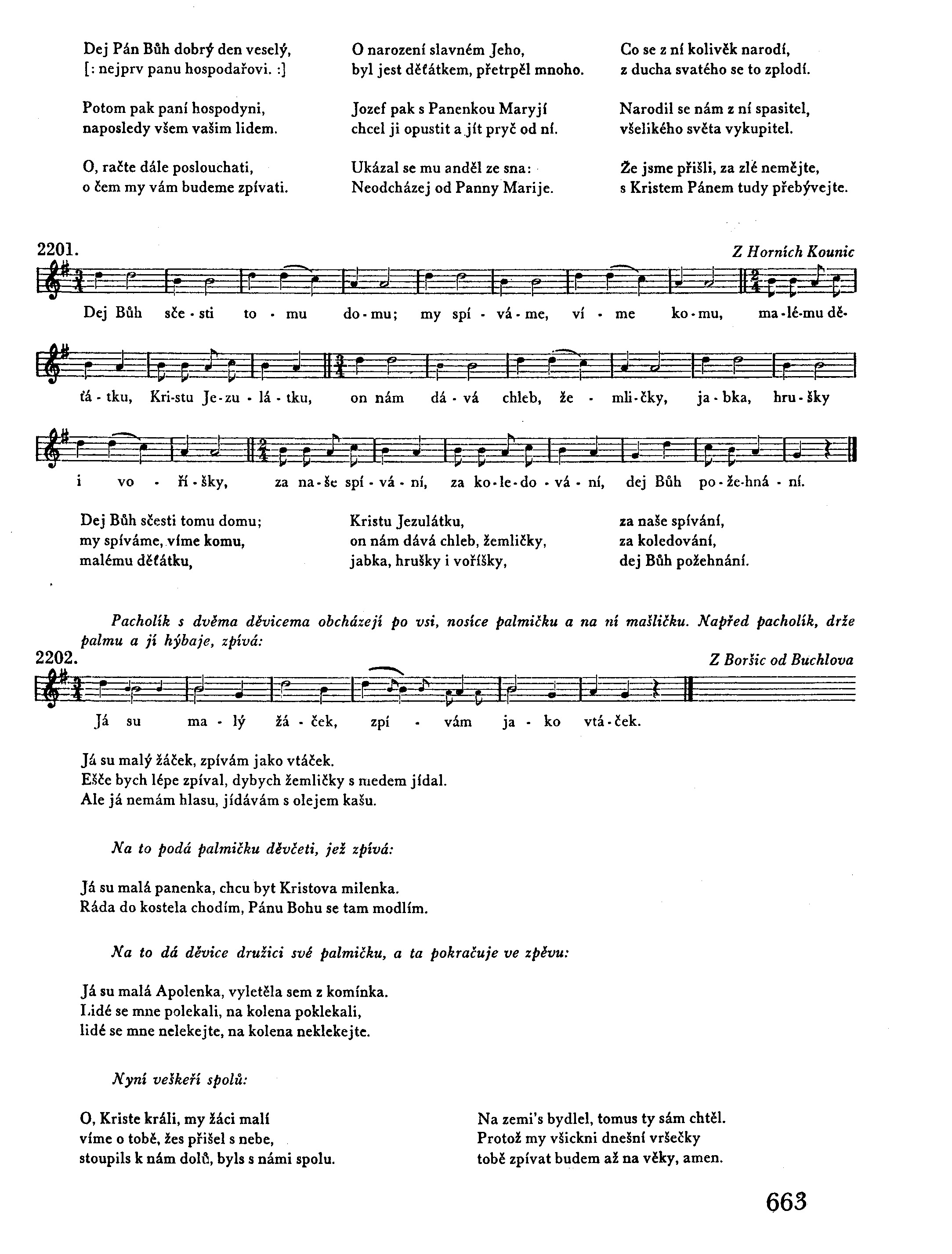[: Kristus Pán se narodil, :] [: po koledičce chodil. :] Chodil po ni cely deň, chodil po ni celu noc. Jak už bylo na rano: Svaty Jene, poď, pomož. Půjděm spolem ku dvoru, buděm zpivať o Bohu. Ten hospodař němeškal, na hospodyň zavolal, koledničky jim poslal. Hospodaři ctnostlivy, děkujem vam z hostiny. Hostili stě hostě sve, koledničky pocestne.