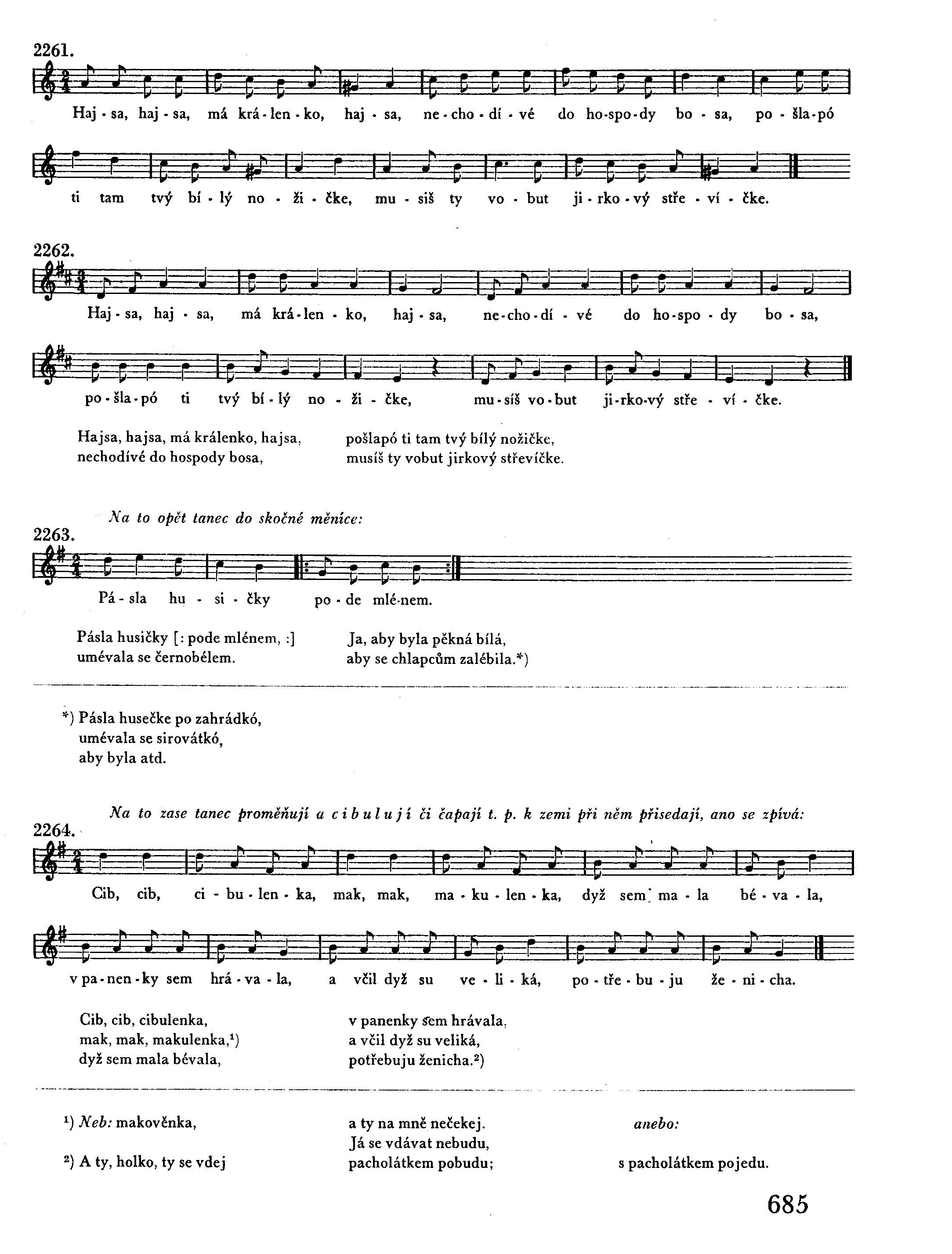 Hasa, hasa, má králenko, hasa, nechodívé do hospode bosa; pošlapó ti tvý bílý nožičke, vobuj na ně svý zlatý střevičke. Co sem já to za královno dostál jako be jo vemalovál, vepsál; vona chodí červená jak růže, každé si jo zamilovat může.