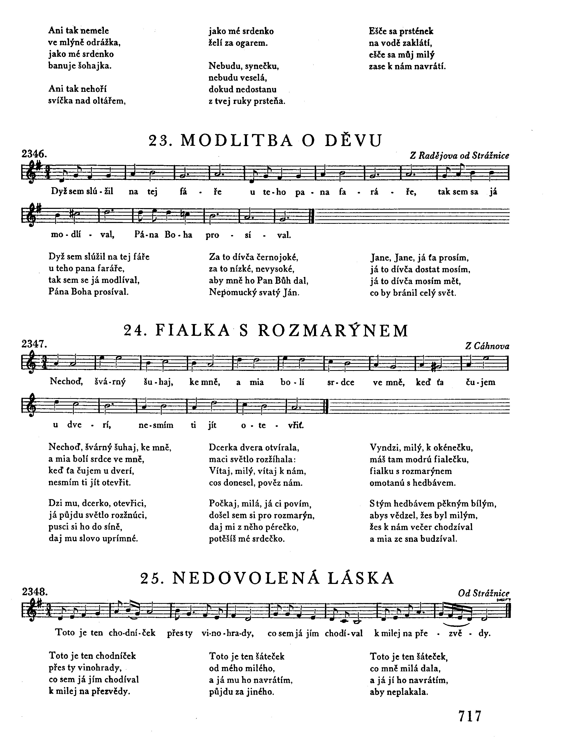 Číž to pachole po vsi chodí [: a dobré lidi :] ze sna budí? A čí by bylo? rychtářovo; chodí pod okenko Tomečkovo. Tluče na okno i na dvéři: Pod mi, má Františko, poď, odevři. Nač bych já tobě otvírala? Dyž tebe miluje panna jiná. Mně nemiluje žádná inší, leda ty, Františko nejmilejší.