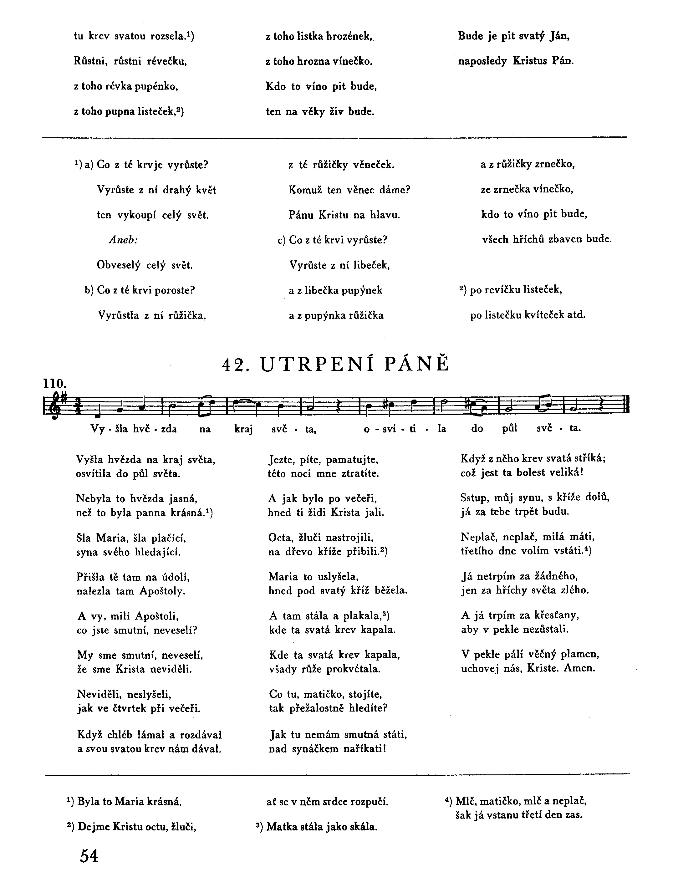 Vyšla hvězda na kraj světa, osvítila do půl světa. Nebyla to hvězda jasná, než to byla panna krásná.1) Šla Maria, šla plačící, syna svého hledající. Přišla tě tam na údolí, nalezla tam Apoštoly. A vy, milí Apoštoli, co jste smutní, neveselí? My sme smutní, neveselí, že sme Krista neviděli. Neviděli, neslyšeli, jak ve čtvrtek při večeři. Když chléb lámal a rozdával a svou svatou krev nám dával. Jezte, píte, pamatujte, této noci mne ztratíte. A jak bylo po večeři, hned ti židi Krista jali. Octa, žluči nastrojili, na dřevo kříže přibili.2) Maria to uslyšela, hned pod svatý kříž běžela. A tam stála a plakala,3) kde ta svatá krev kapala. Kde ta svatá krev kapala, všady růže prokvétala. Co tu, matičko, stojíte, tak přežalostně hledíte? Jak tu nemám smutná státi, nad synáčkem naříkati! Když z něho krev svatá stříká; což jest ta bolest veliká! Sstup, můj synu, s kříže dolů, já za tebe trpět budu. Neplač, neplač, milá máti, třetího dne volím vstáti.4) Já netrpím za žádného, jen za hříchy světa zlého. A já trpím za křesťany, aby v pekle nezůstali. V pekle pálí věčný plamen, uchovej nás, Kriste. Amen.