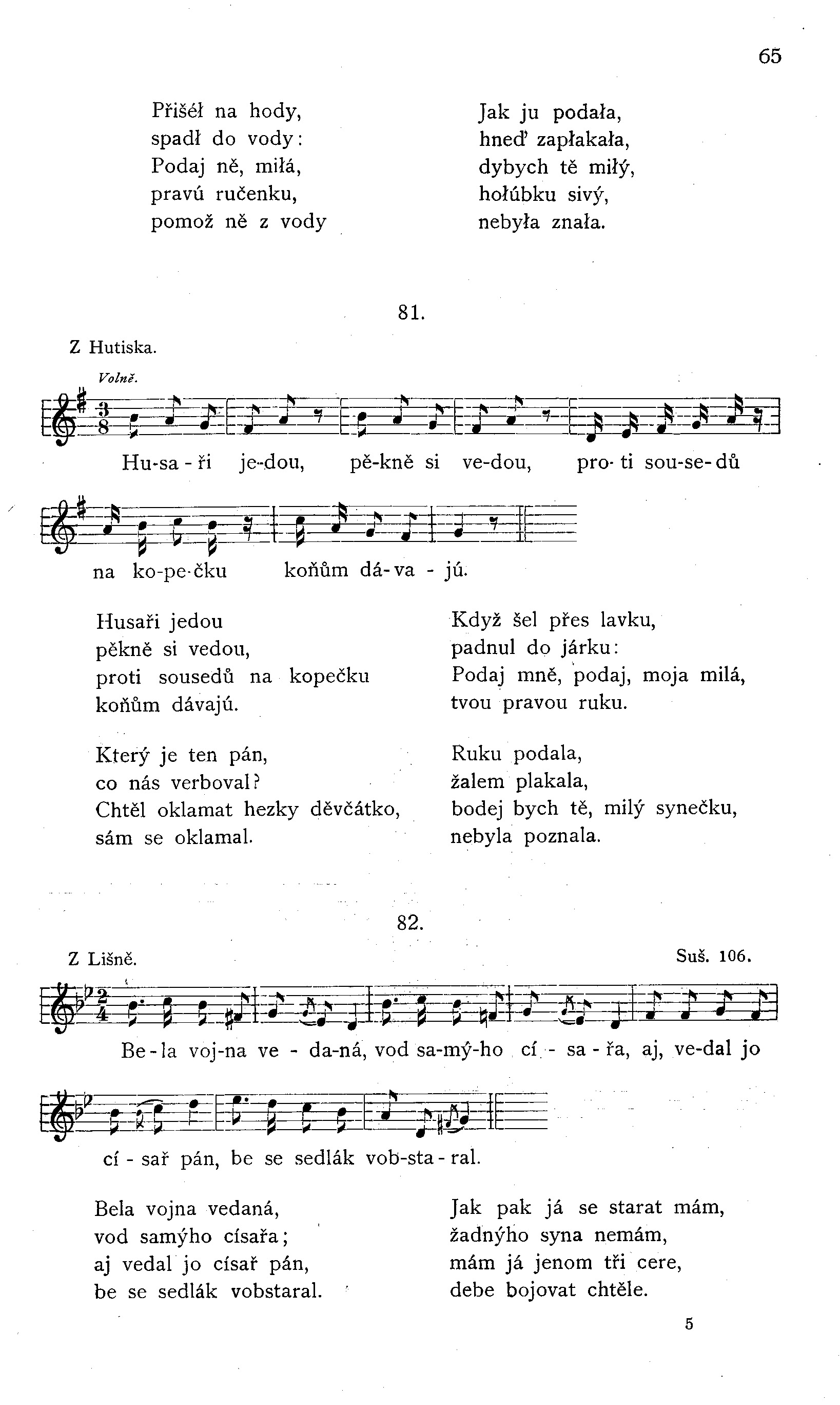Bela vojna vedaná, vod samýho císařa ; aj vedal jo císař pán, be se sedlák vobstaral. Jak pak já se starat mám, žadnýho syna nemám, mám já jenom tři cere, debe bojovat chtěle. Zavolal to néstarší při její polní práci : »Poď, mý dítě, poď domu, pudeš za mně na vojnu !« Já, tatíčko, nepudo, já bojovat nebudo, já so srce měkkýho, já se bojím každýho. Zavolal to prostřední, to, keró měl srce k ní, »Poď, mý dítě, poď domu, pudeš za mně na vojnu !« Já, tatíčko, nepudo, já bojovat nemůžo, já so srce měkkýho, nezabijo žádnýho. Zavolal to némlačí, to, keró měl néračí: »Poď, mý dítě, poď domu, pudeš za mně na vojnu !« Já tatíčko, já pudo, já bojovati budo, já so srce tvrdýho, nebojím se žádnýho. Dež jí vlase stříhale, vobě sestre plakale : »Proč nade mnó plačete, dež bojovat nechcete ?« Dež na koňa sedala, paláš na bok připjala, všem roko podávala, na vojno se těšila. Dež do vojne přijela, tři sta Turků zajala ; podivil se císař pán, jesli je to husar sám. Jesli je to husar sám, bode u mně věrné pán, jesli je to husarka, bode moja manželka.