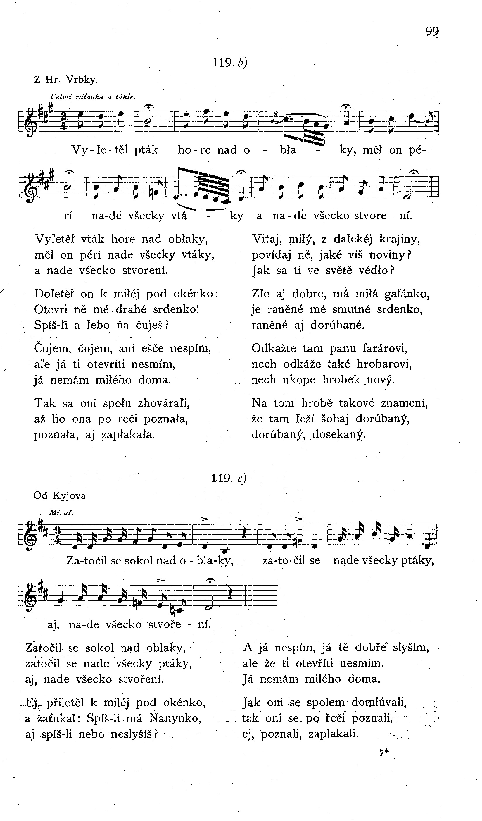 Vyľetěł vták hore nad obłaky, měł on pérí nade všecky vtáky, a nade všecko stvorení. Doľetěł on k miłéj pod okénko: Otevri ně mé drahé srdenko! Spíš-ľi a ľebo ňa čuješ? Čujem, čujem, ani ešče nespím, aľe já ti otevríti nesmím, já nemám miłého doma. Tak sa oni społu zhováraľi, až ho ona po řeči poznała, poznała, aj zapłakała. Vitaj, miłý, z daľekéj krajiny, povídaj ně, jaké víš noviny? Jak sa ti ve světě védło? Zľe aj dobré, má miłá gaľánko, je raněné mé smutné srdenko, raněné aj dorúbané. Odkažte tam panu farárovi, nech odkáže také hrobarovi, nech ukope hrobek nový. Na tom hrobě takové znamení, že tam ľeží šohaj dorúbaný, dorúbaný, dosekaný.