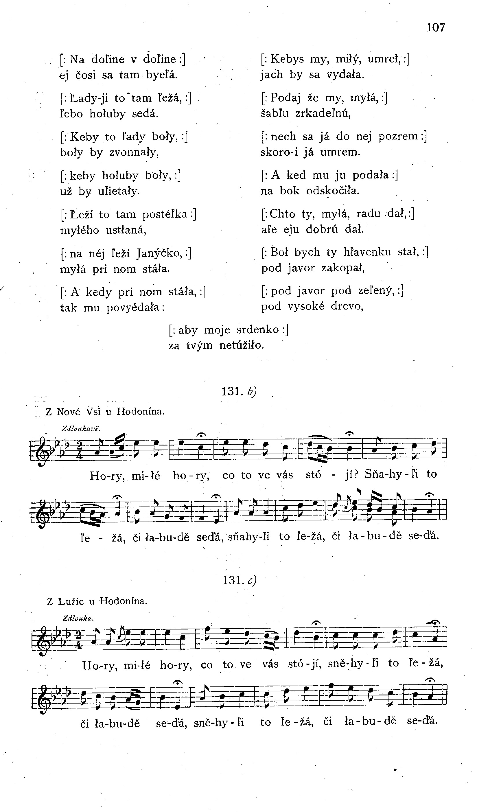 Hory, miłé hory, co to ve vás stójí, [: sňahy-ľi to ľežá či łabudě seďá? :] Dyby były sňahy, snaď by roztajały, [: były by łabudě, snáď by uľetěły. :] Aľe to tam stójí posteľ maľovaná, [: na ní ľeží šohaj, hłava porúbaná. :] Miłá při něm stójí, žałostně naříká, [: červeným šátečkem očka si utírá. :] Ani ně neumřeš, ani neokřéješ, [: ani ně neříkáš, esľi si ňa vezmeš. :] Podaj ně, má miłá, šabľu zrcadľenú, [: potem já ti povím, esľi si ťa vezmu. :] Šabľu mu podała, na bok odskočiła, [: na jeho srdečku fałeš ucítiła. :] Kdo ti, moja miłá, do ti tu radu dáł, [: frajárenko moja, ten dobře uděłáł. :] Nedáł ně ju žádný, dała sem si sama, [: na tvojém srdečku, zradu sem poznała. :] Co bys ně, můj milý s tú šabľú uděłáł? [: Galánečko moja, był bych ti hlavu sťáł. :] Był bych ti uděłáł, svaďbu bez ohłášek, [: až by ně był zostáł krvavý pałošek. :] Był bych ti, má miłá, był bych ti hłavu sťáł [: by ťa po méj smrti žádný víc nedostáł. :]