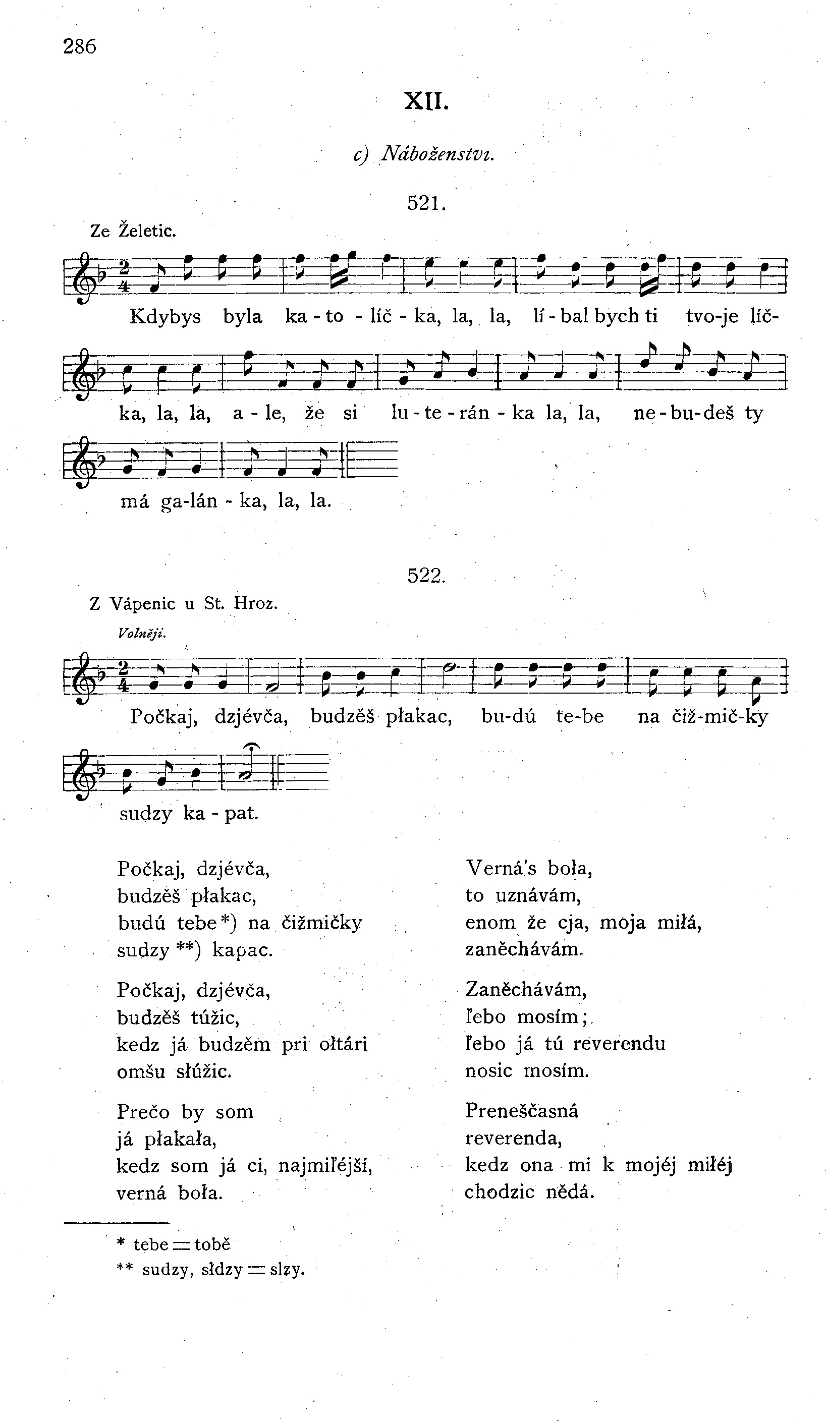Milovala som ťa verně ze srdečka svého, verila som tvoje slova, ale už je darmo, dokel som něvedzela, že je láska falešná, včil už verím, aj uznávám, keď sama ostávám. A ta tvoja stará máci, ta je tom príčina, ta nám toho velikého žalu narobila; tebe braňja rodiče, něchodzievaj k nám viece, povedz pravdu, něchodz za mňú, nětrap moje srdce. A keď tebe tak dávajú statky a cisíce, se mňú ty ništ nědostaněs, len uprimné srdce; trebár som já chudobná, k roboce som šikovná, a kerá má velké statky, ta je na ništ hodná.