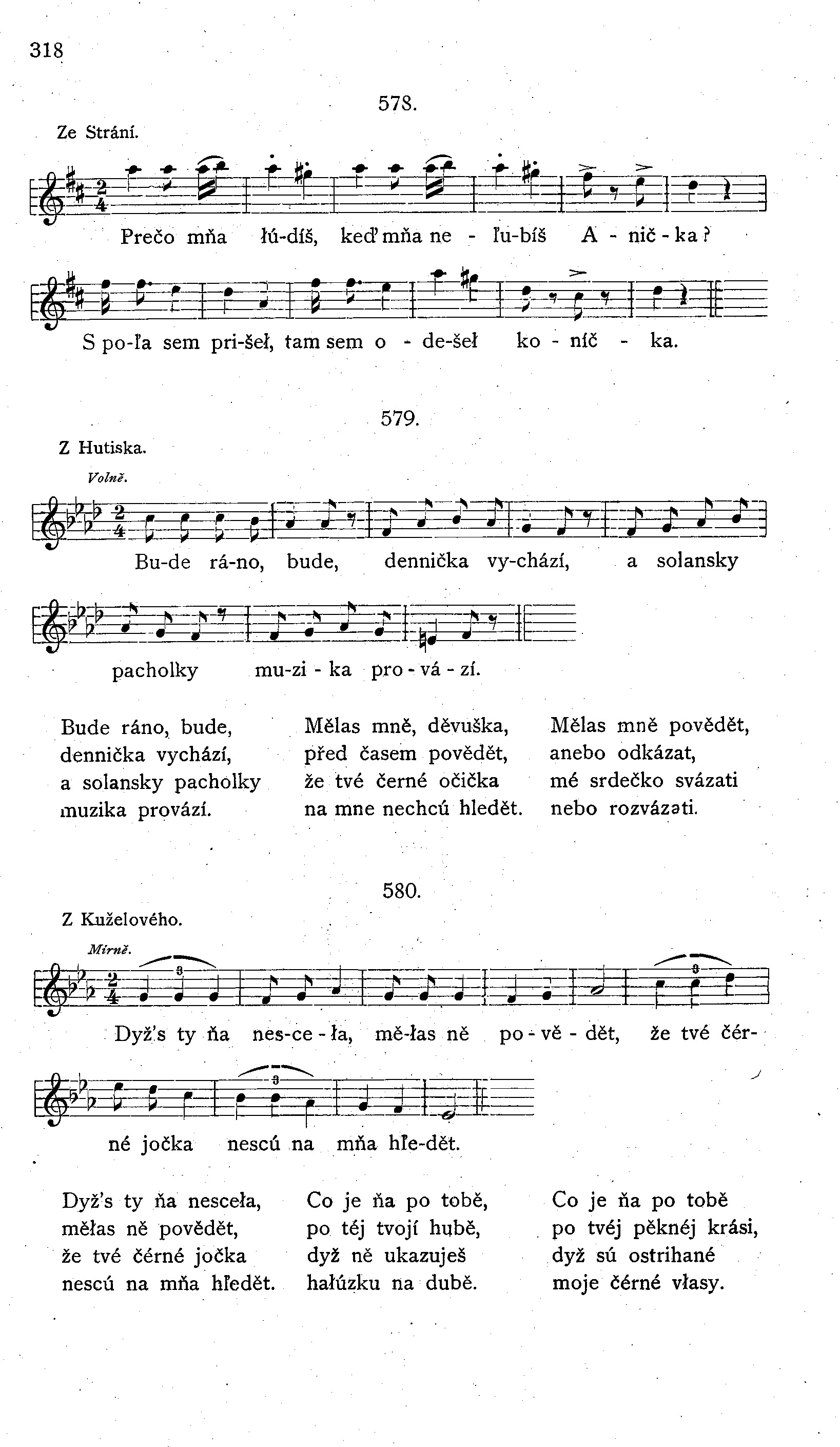 Bude ráno, bude, dennička vychází, a solansky pacholky muzika provází. Mělas mně, děvuška, před časem povědět, že tvé černé očička na mne nechcú hledět. Mělas mně povědět, anebo odkázat, mé srdečko svázati nebo rozvázati.