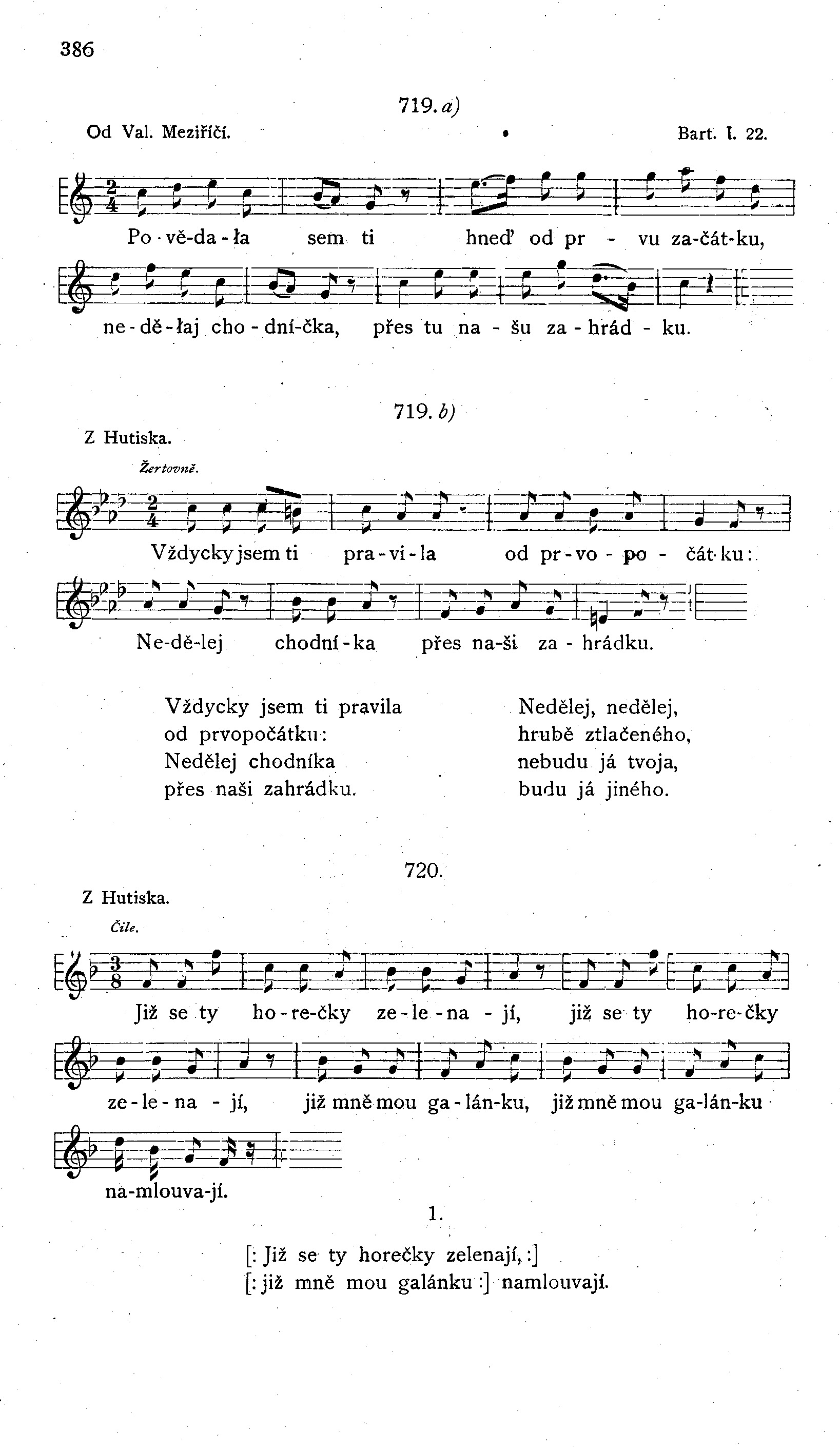 [: Již se ty horečky zelenají, :] [: již mně mou galánku :] namlouvají. [:Kdo si ji namlouvá, nech si ji má, :] [: ať se s ní přede mnou:] neobjímá. [: Kdyby přede mnou se objímali, :] [: těžké by mne srdce :] udělali. 2. [: Počkej, ty dostaneš darebáka, :] [: tuláka, pijáka, :] karbaníka. [: Co tobě otec tvůj neb máti dá, :] [: on ti to propije :] v kartách prohrá. [: Děti tobě doma budou plakat, :] [: dej, maměnko, chleba :] budou volat. [: Ty tam za ním půjdeš jako žena, :] on ti tam vybije, vypere, vykope jako šelma.