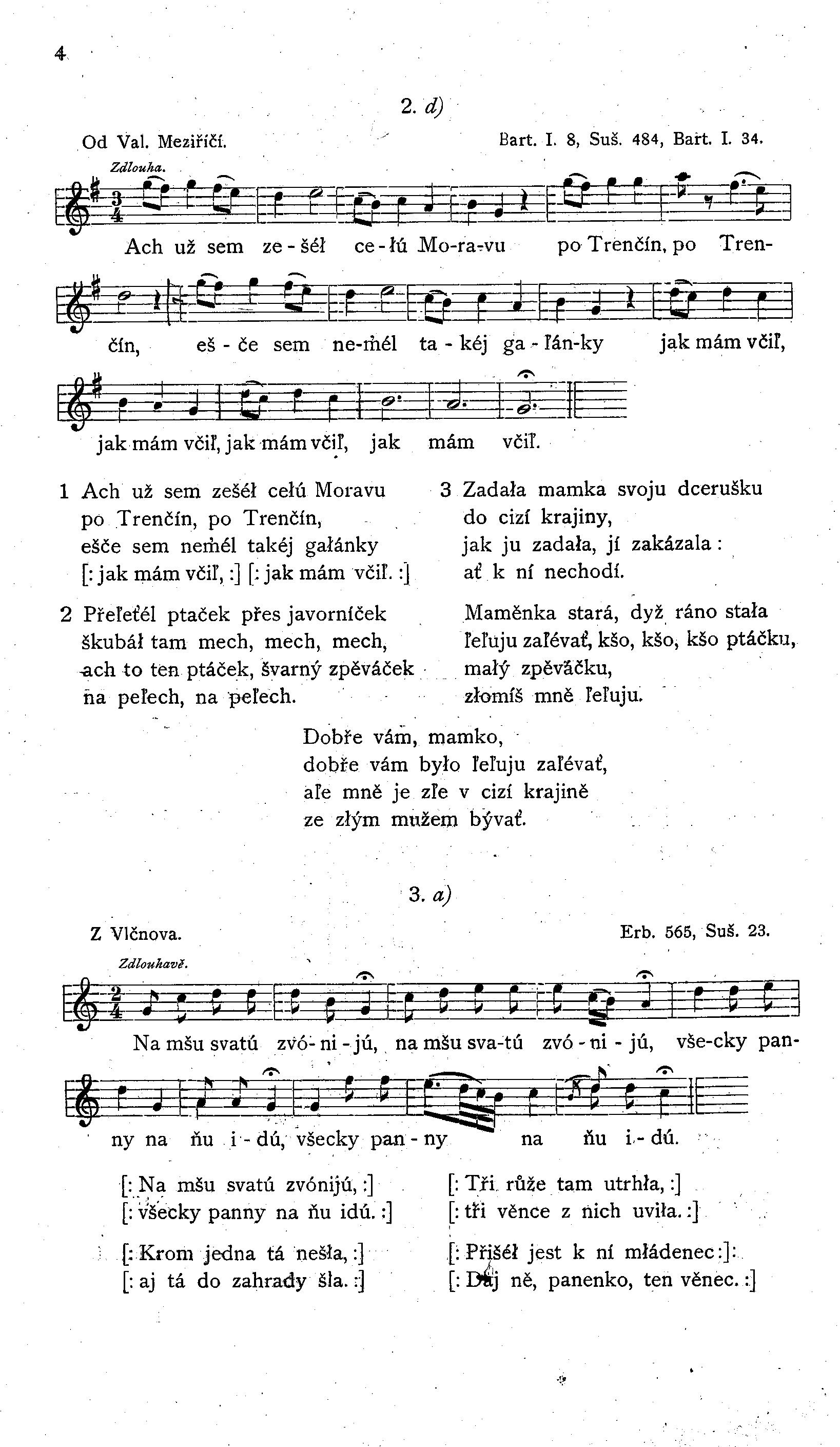 O sv. Dorotě. Byla svatá Dorota, Pobožného života, Pěkně, čistě chodila, Protože svatá byla. Šla jednou přes králův háj, Potkal ji tam sám pan král. Chceš Doroto, chceš mou být? Chce ti celý svět sloužit; »Nechci, králi, nebudu, Slíbila jsem jinému, Slíbila jsem jinému, A to Bohu samému.« Král se na ňu rozhněval, Do žaláře vsadit dal, Do žaláře vsadit dal A na vojnu odjechal. Sedm let tam bojoval, Na osmý rok přijechal. A jak domů přijechal, Na Dorotu hned se ptal. Je Dorota, je, žije, Nejí ani nepije. Král se na ni rozhněval A katu ji pod moc dal. Kat s ní ide po mostě, Rozmlouvá s ní po sprostě: Chceš, Dorotko, chceš mou být? Chci ti život zachránit. »Nebyla jsem královou, Ne tak býti katovou.« Kat se na ni rozhněval, Na oleji smažit dal; Ona Boha prosila, Aby hrom bil do kola A hned z čistého jasna, Až se země otřásla. Lidé práce nechali A ku králi spěchali Pane králi pravda jest, Že Dorota svatá jest »Vezmi kate sekeru, Setni Dorotě hlavu.« Již je Dorota sťata, Duše do nebe vzata Andělé duši vzali A tělo pochovali. Doneste jí lilie, Od Panenky Marie, Doneste jí ovoce Od nebeského Otce.