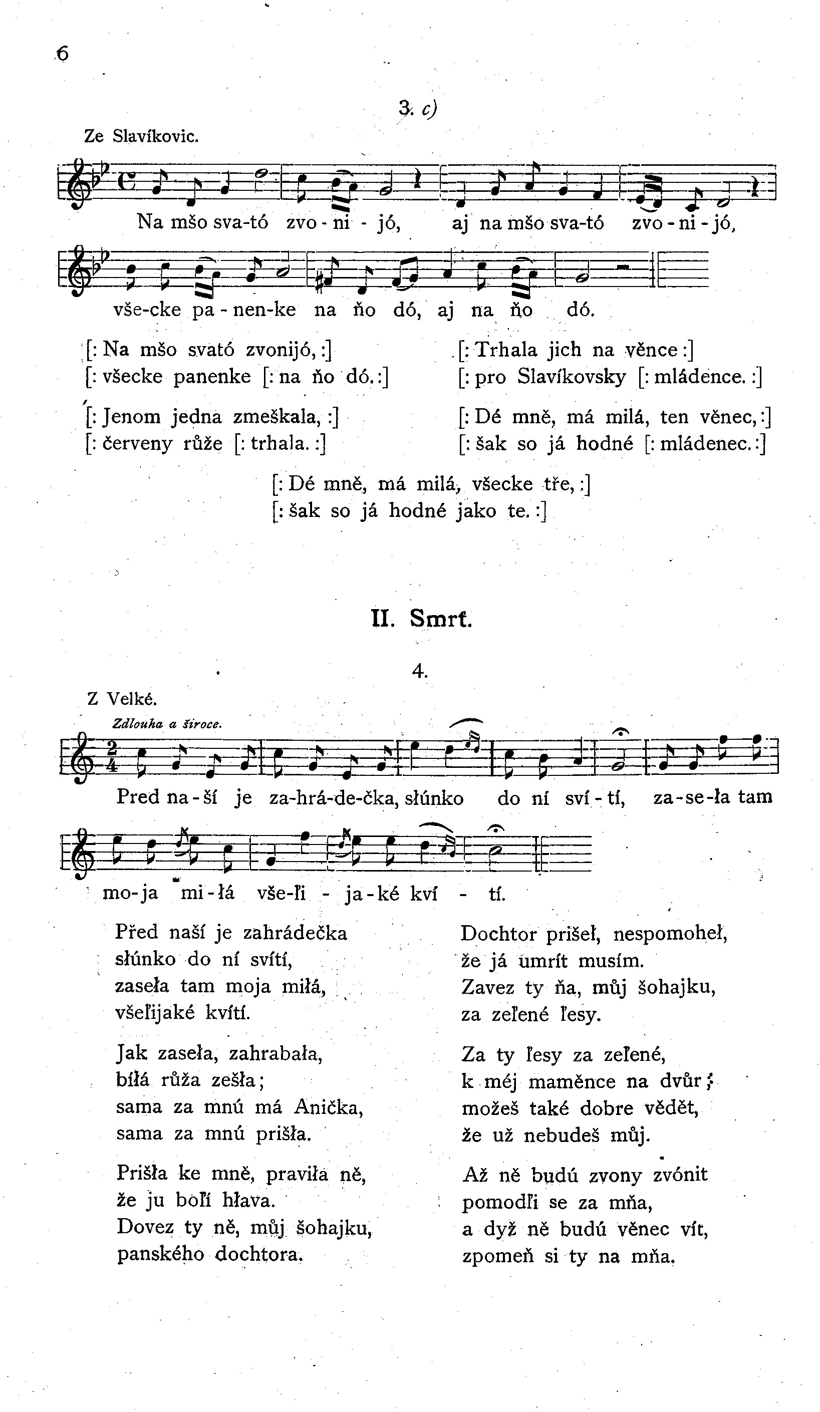 [: Na mšo svató zvonijó, :] [: všecke panenke [: na ňo dó. :] [: Jenom jedna zmeškala, :] [: červeny růže [: trhala. :] [: Trhala jich na věnce :] [: pro Slavíkovsky [: mládence. :] [: Dé mně, má milá, ten věnec, :] [: šak so já hodné [: mládenec. :] [: Dé mně, má milá všecke tře, :] [: šak so já hodné jako te. :]