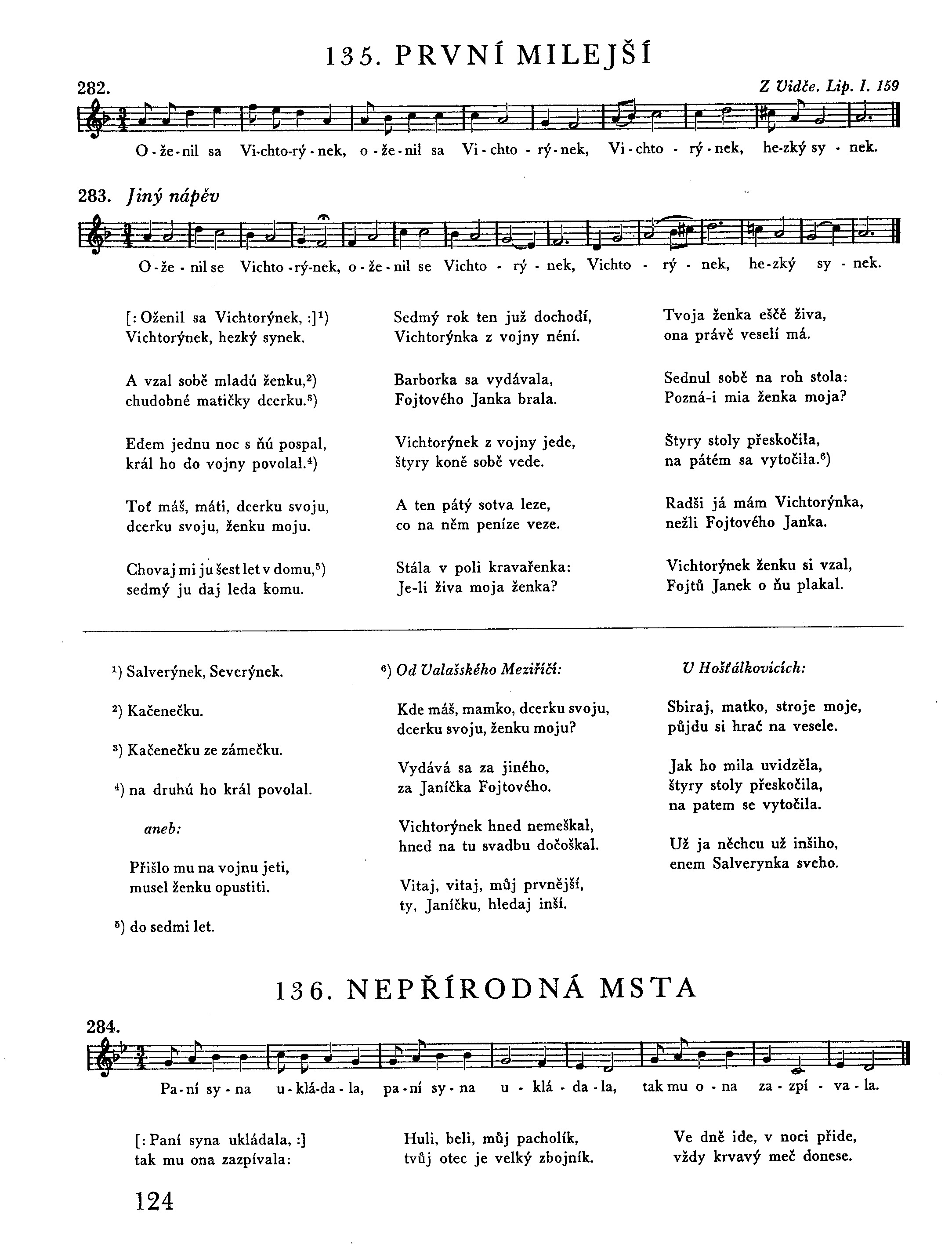 [: Oženil sa Vichtorýnek, :] 1) Vichtorýnek, hezký synek. A vzal sobě mladú ženku, 2) chudobné maticky dcerku. 3) Edem jednu noc s ňú pospal, král ho do vojny povolal. 4) Toť máš, máti, dcerku svoju, dcerku svoju, ženku moju. Chovaj mi ju šest let v domu, 5) sedmý ju daj leda komu. Sedmý rok ten juž dochodí, Vichtorýnka z vojny néní. Barborka sa vydávala, Fojtového Janka brala. Vichtorýnek z vojny jede, štyry koně sobě vede. A ten pátý sotva leze, co na něm peníze veze. Stála v poli kravařenka: Je-li živa moja ženka? Tvoja ženka eščě živa, ona právě veselí má. Sednul sobě na roh stola: Pozná-i mia ženka moja? Štyry stoly přeskočila, na pátém sa vytočila. 6) Radši já mám Vichtorýnka, nežli Fojtového Janka. Vichtorýnek ženku si vzal, Fojtů Janek o ňu plakal.