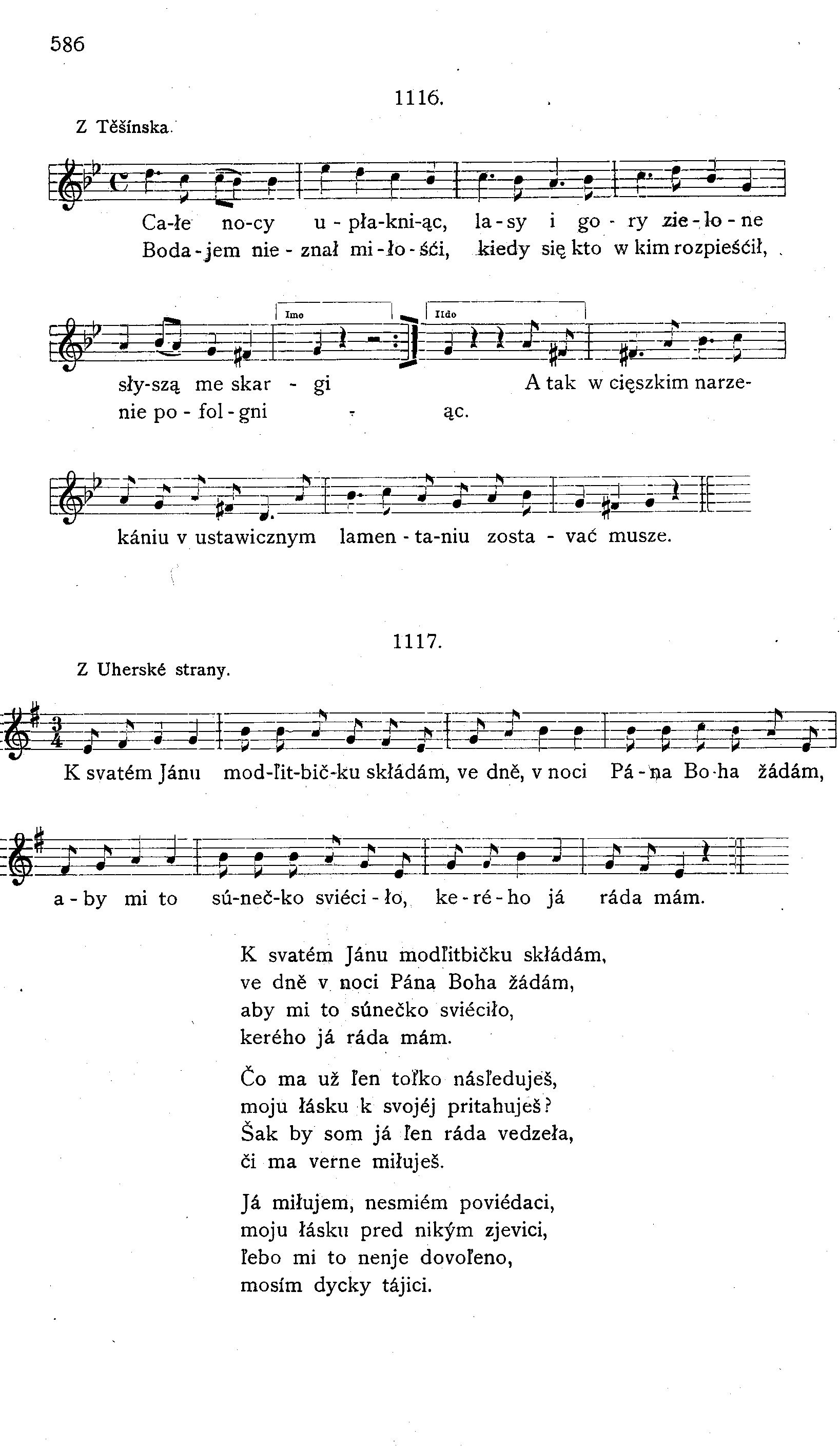 K svatém Jánu modľitbičku skłádám, ve dně v noci Pána Boha žádám, aby mi to súnečko sviéciło, kerého já ráda mám. Čo ma už ľen toľko násľeduješ, moju łásku k svojéj pritahuješ? Šak by som já ľen ráda vedzeła, či ma verne miłuješ. Já miłujem, nesmiém poviédaci, moju łásku pred nikým zjevici, ľebo mi to nenje dovoľeno, mosím dycky tájici. V svéj tajnosci na teba poziérám, v svéj tajnosci svú łásku zakrývám, aby sa to naši nezvedzeľi veľice sa obávám. Trebar to já pred nikým nepoviém, aľe si ty dycky v srdci mojém, mé myšľénky sú dycky o teba, jako ta já zabudem.