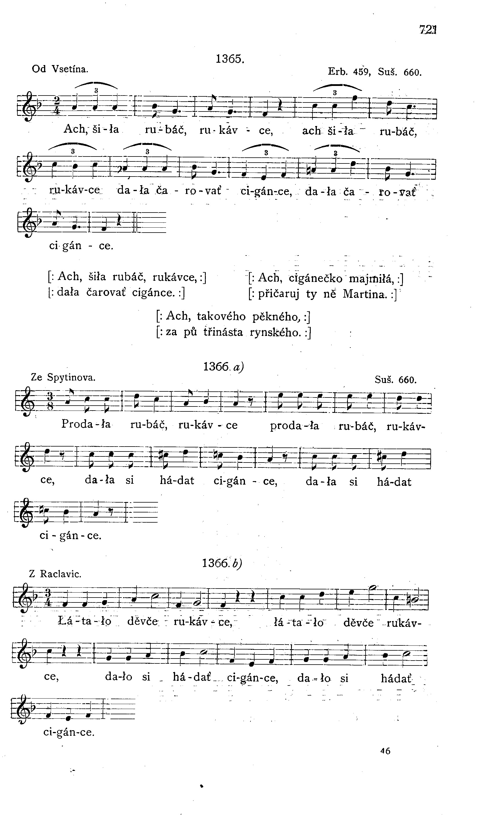 [: Ach, šiła rubáč, rukávce, :] [: dała čarovať cigánce. :] [: Ach, cigánečko majmiłá, :] [: přičaruj ty ně Martina. :] [: Ach, takového pěkného, :] [: za pů třinásta rynského.:]