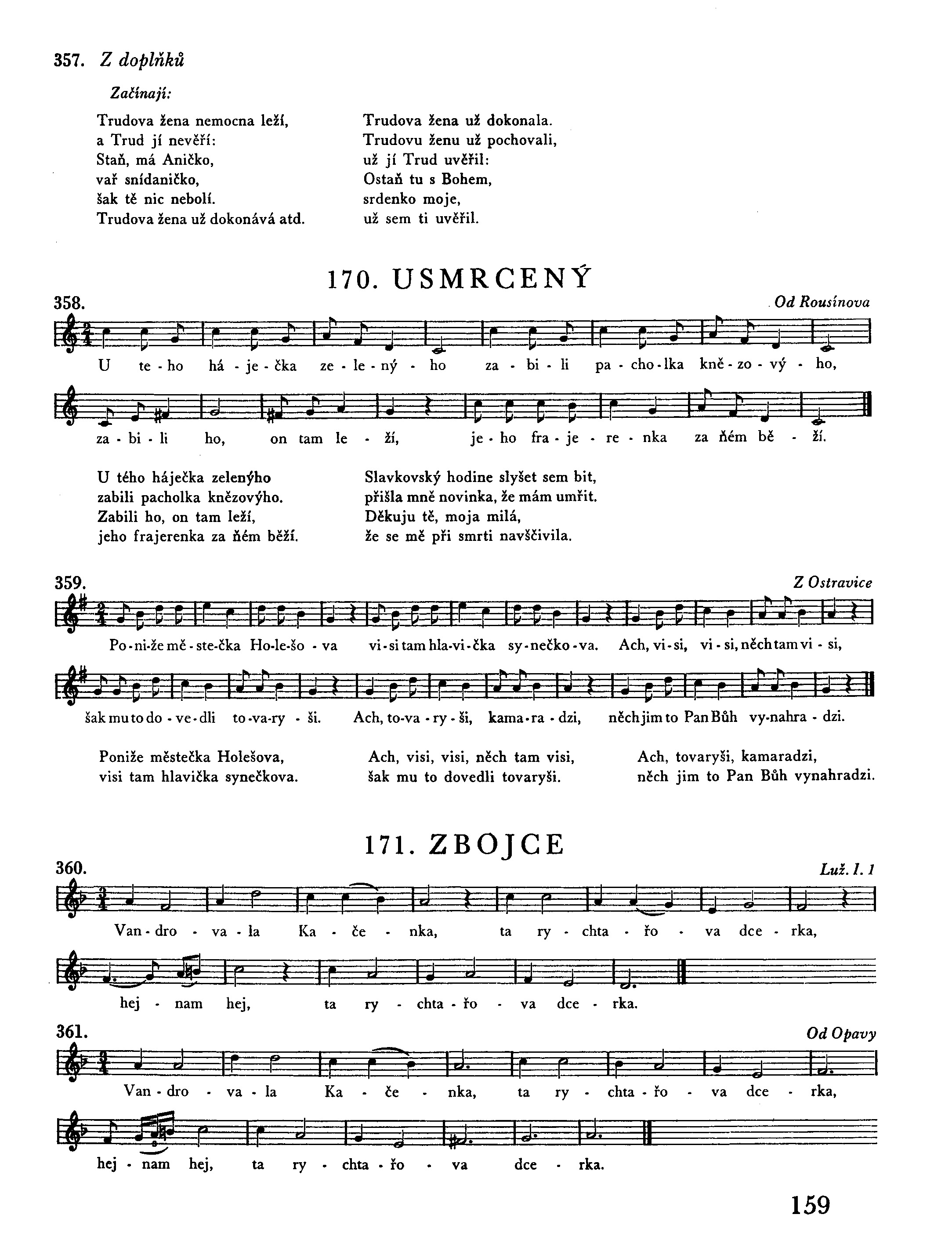 [: Bylatě stará kovářka, :] [: měla synáčka Václavka. :] Nedala se mu ženiti, kázala mu vandrovati. Vandruj, Václavku, vandruj preč, dám ti na cestu ostrý meč. A Václavek se rozhněval, do Holešova vandroval. A zabil tě tam jedneho, u Holešova druhého. Už v Holešově zvonijú a Václavka už honijú. Už v Holešově přestali, že už Václavka dostali. Zkažte tam mojé mateři, ať mě nečeká k večeři. Ach, ani zítra k obědu, už mě do Brna povedú. Nech mně pošle košulenku, tu konopnú a tu tenkú. V konopné budu choditi a v tenké budu viseti. Nevěšejte mne na duby, objedli by mě holubi. Pověšte mě radš na jedlu, kam chodí milá pro vodu. Až té voděnky nabere, holuby se mne zežene. Ej, hukša, hukša s milého, nejezte těla bílého. Ej, nežerte mu nožiček, co k nám šlapaly chodníček. Ej, nežerte mu ručiček, co mně nosily perníček. Ej, nežerte mu hlavěnku, co mně lúbala huběnku. Nežerte těch černých očí, co mě přivodily k pláči. 1) A holubi jenom žrali, kosti jenom zanechali. 2)