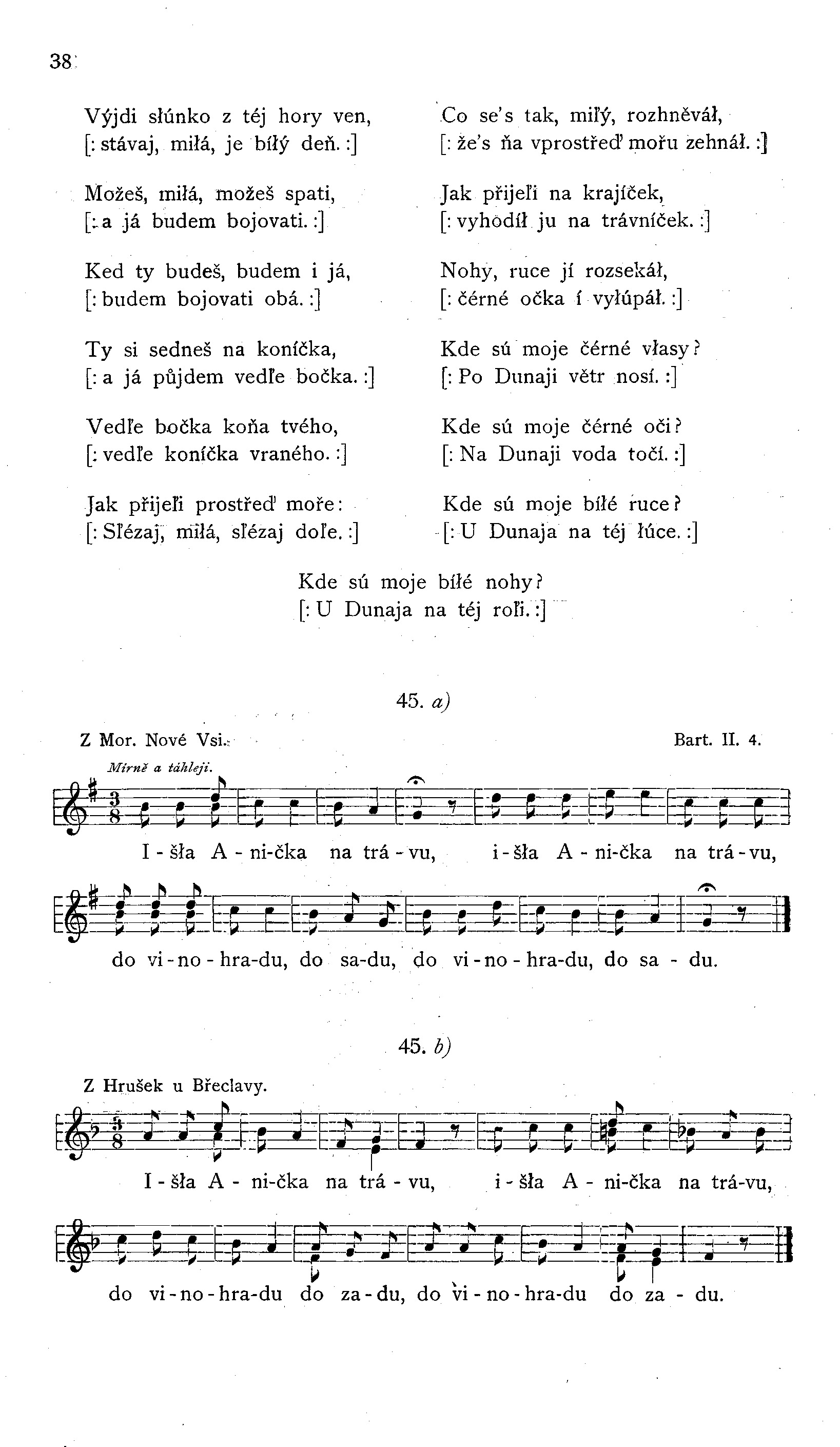 [: Úhory, úhory, šecky poorané, :] [: de bude napásat :] šohaj koně vrané? [: Úhory, úhory, šecky poorané, :] [: rozputnał šohajek :] štyry koně vrané. [: Rozputnał, rozputnał, nemože ich chytnút, :] [: nemože šohajek :] svéj miléj odvyknút.