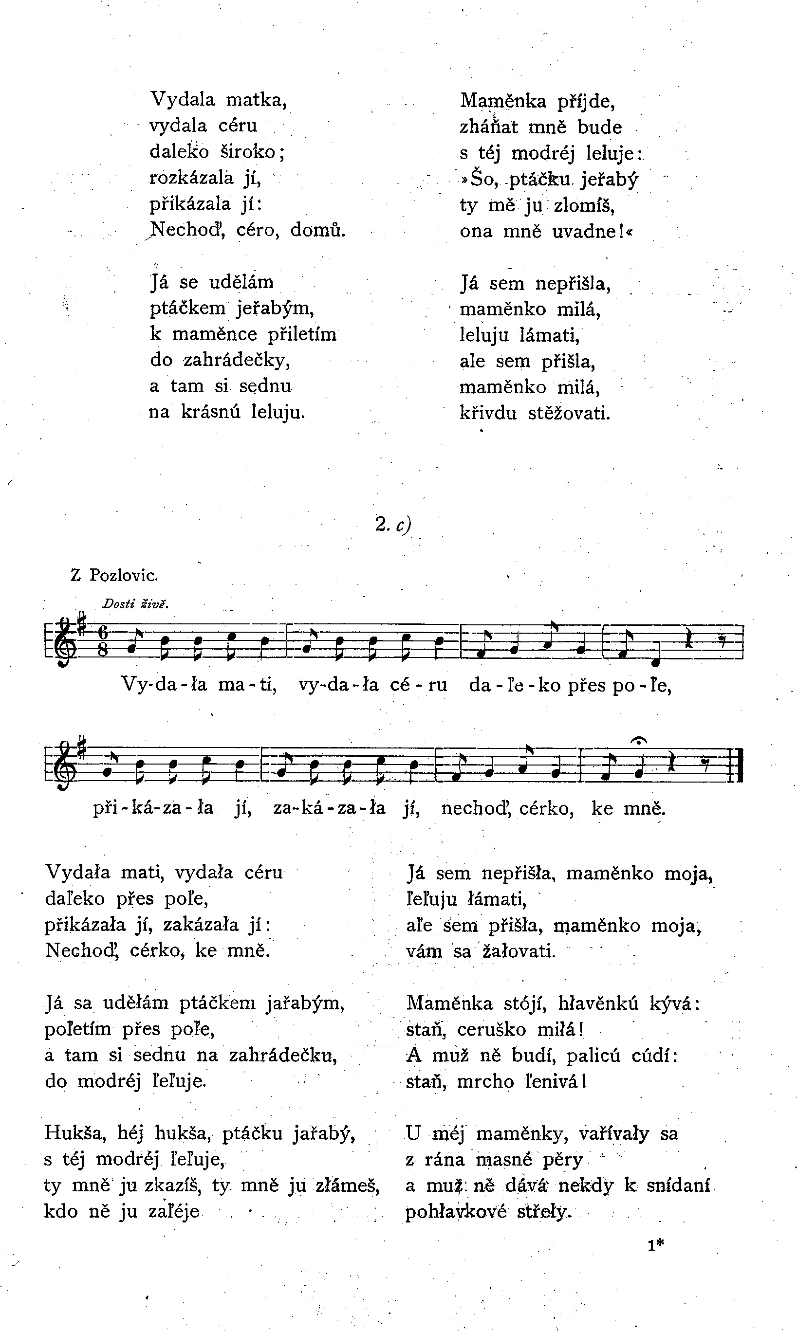 Zadala1) máti, zadala dceru daleko od sebe,2) zakázala jí, přikázala jí: Nechoď, dcero, ke mně. Já se udělám ptáčkem jařabým, poletím k maměnce,3) a sednu si tam na zahradečku na bílú leluju. Vyjde maměnka: Co to za ptáčka? Tak vesele zpívá, jak zpívávala má dcera milá, dyž doma bývala. Ei, kšohej, kšohej, ptáčku jařabý, nelámaj leluje!4) Jak mně ju zlomíš a nedolomíš, ona mně uvadne.5) Nepřišla jsem já, maměnko milá, leluje lámati, ale sem přišla, maměnko milá, sobě stěžovati.6) Dobře vám bylo, maměnko milá, leluju saditi, ale mně je zle, maměnko milá, se zlým mužem býti. Nechoď, dcero má, nechoď, má dcero, křivdu žalovati. Když jsi to chtěla, to jsi se, dcero, měla nevdávati.
