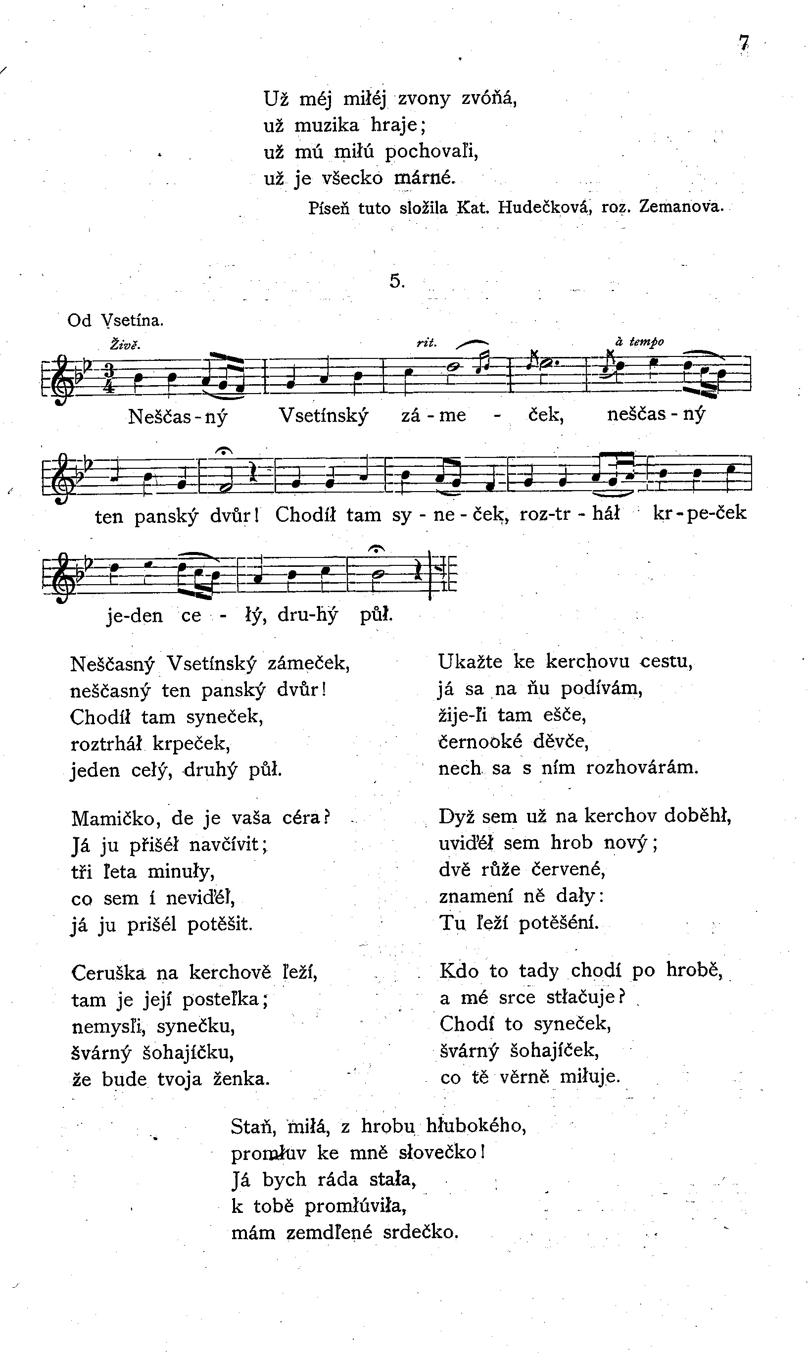 Neščasný Vsetínský zámeček, neščasný ten panský dvůr! Chodíł tam syneček, roztrháł krpeček, jeden cełý, druhý půł. Mamičko, de je vaša céra? Já ju přišéł navčívit; tři leta minuły, co sem í neviďél, já ju přišéł potěšit. Ceruška na kerchově ľeží, tam je její posteľka; nemysľi, synečku, švárný šohajíčku, že bude tvoja ženka. Ukažte ke kerchovu cestu, já sa na ňu podívám, žije-ľi tam ešče, černooké děvče, nech sa s ním rozhovárám. Dyž sem už na kerchov doběhł, uviďéł sem hrob nový; dvě růže červené, znamení ně dały: Tu ľeží potěšéní. Kdo to tady chodí po hrobě, a mé srce stłačuje? Chodí to syneček, švárný šohajíček, co tě věrně miłuje. Staň, miłá, z hrobu hłubokého, promłuv ke mně słovečko! Já bych ráda stała, k tobě promluviła, mám zemdľené srdečko.