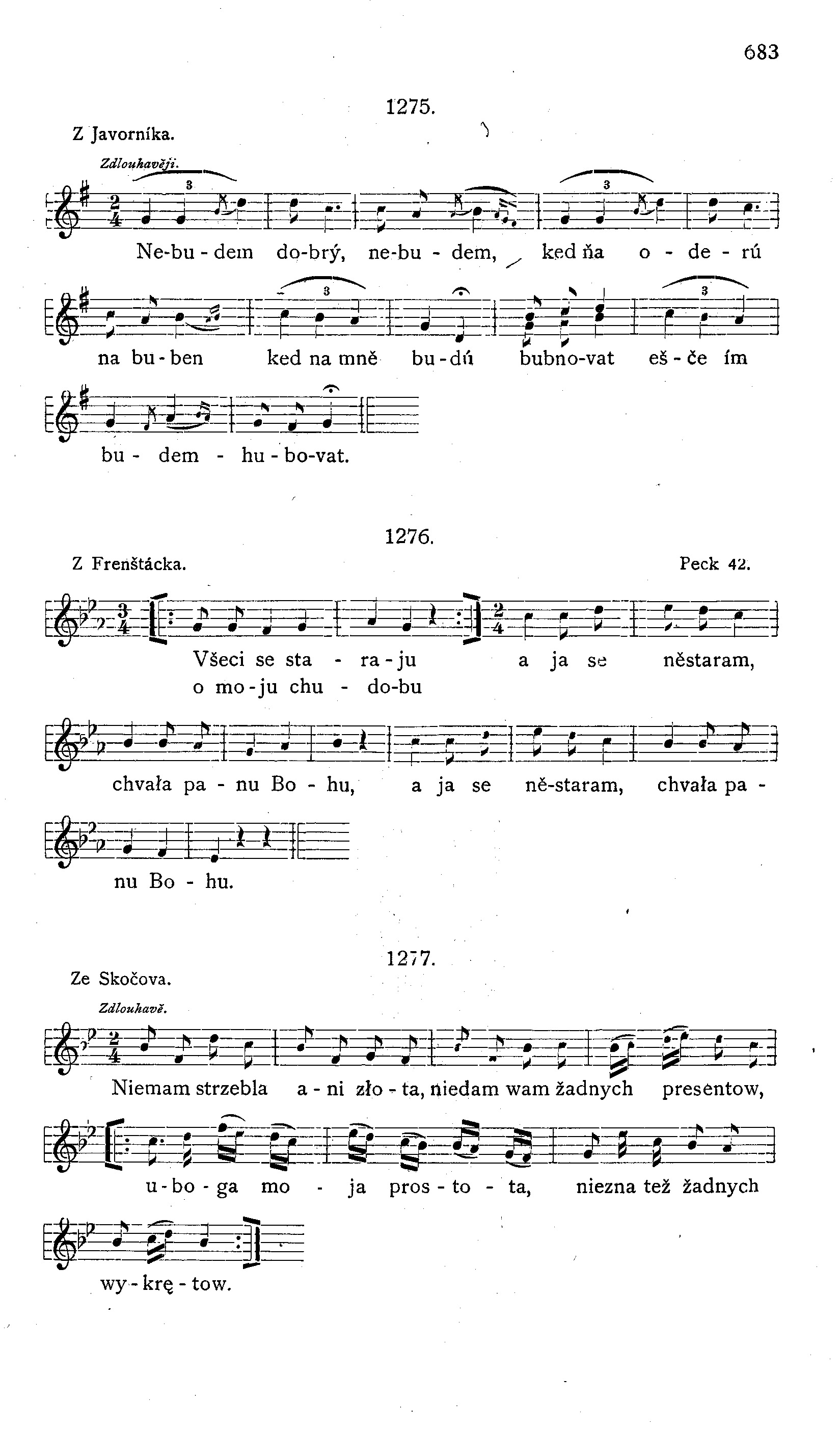 A když rano, raňusěnko drobny dešč pada, susědova kravarečka kravy vyhaňa. Vyhnala jich v šire pole a tam plela len; přijel tu k ni šohajiček na koňu branem.1) Pomož Pan Bůh, ma děvečko, jak ty pleješ len. Dajž to Pan Bůh, můj synečku, nějeď mi přezeň. Něpojedu, ma děvečko, slub mi moju byť. »Co bym ja ti slubovala? Něumim robiť. Něumim ja kaše vařiť, ani chleba pecť.« Něstaraj se, moja mila, naučím tě přec. Kyj dubovy, kyj dubovy nauči vařiť, a hrabovy, ten nauči těbe chleba pecť. Než bys ty mně, můj synečku, měl kyje chystať, volim radše, můj synečku, těbe zanechať. Už sem ja je opuščeny jak ten polni ptak, kery lice ve dně v noci po horach, dolach.