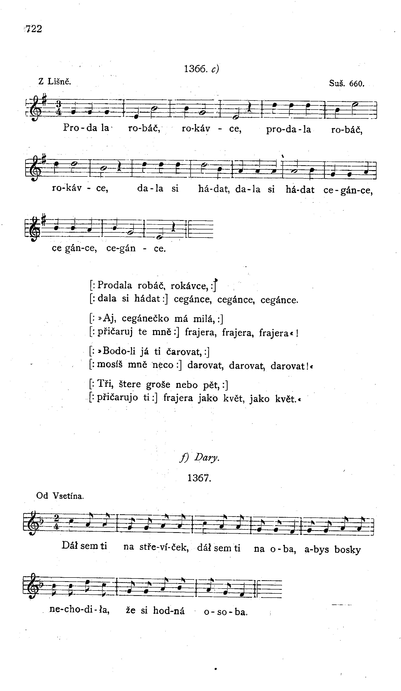 Seděla pod borovičkou, plakala, že má chudičkou kytičku rozmarínovou na zahrádce. Prosila božího deště, aby jí vyrostla ještě kytička rozmarinová na zahrádce. Mladost, radost! ani mně nedají dorost: včera mně minulo patnáct let, už jsem jich přelhala devět. Nedám, nedám, mládenci, to vám povídám, se stromu jablíčka trhali: musíte času čekati. Kdyby bylo nesvítalo, bylo by mi děvče dalo tři hubičky nebo čtyry, to je děvče roztomilý! Už jdou děvčátka z Lomečku, už jdou děvčata z Lomce: mají červeny čepení, mají zeleny věnce. Pověz mně, och má znejmilejší! kudy k vám budu chodit? Vokolo humen je cestička, ta tě k nám bude vodit. Vokolo humen je cestička, je pěkná drnovatá: kdy ty k nám, můj Honzíčku, pří-deš, sedni před naše vrata. Před těma našima vratami je pěknej bílej kámen: kdy ty k nám, můj Honzíčku, přídeš, jenom si sedni na něn. Před těma našima vratami je pěknej kameníček: aby vo tom lidi věděli, že jsi můj milovníček. Šafáři,[19] mlynáři! z vašeho dvora krásná osoba vychází. Jeníčku, bratříčku! nabí flintičku, postřel Aničku na hrázi. Nechám jí, neznám ji: ona mně koupí na pěkný šaty hedbáví. Já jí zas zlatý pás, stříbrný přazky, zlaty podvazky: „Tu máš, Ančičko, zlatá perličko! lásku zas.“ Adámku náš! co pak děláš? na lonce ti pasou,