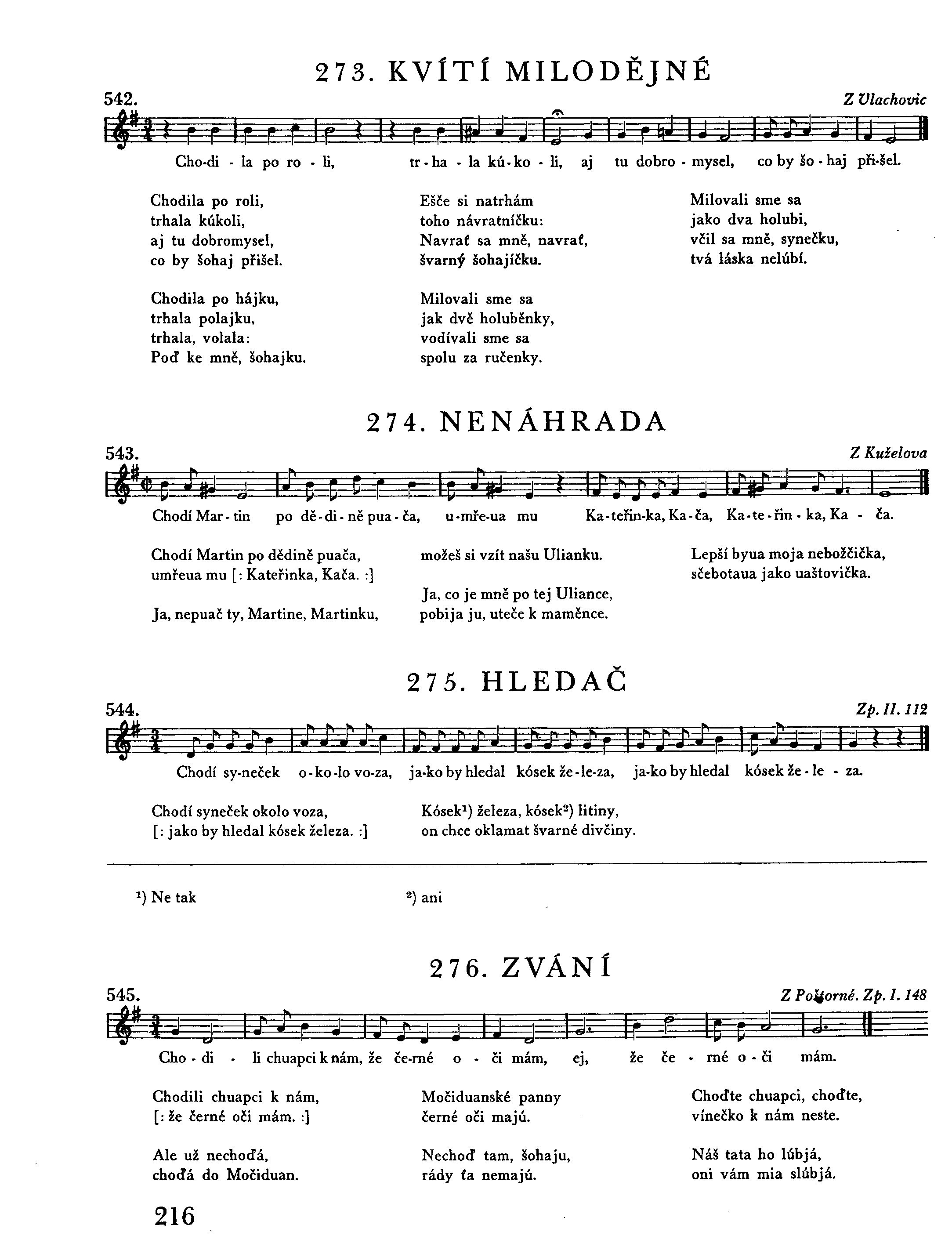 Chodili chuapci k nám, [: že černé oči mám. :] Ale už nechoďá, choďá do Močiduan. Močiduanské panny černé oči majú. Nechoď tam, šohaju, rády ťa nemajú. Choďte, chuapci, choďte, vínečko k nám neste. Náš tata ho lúbjá, oni vám mia slúbjá.