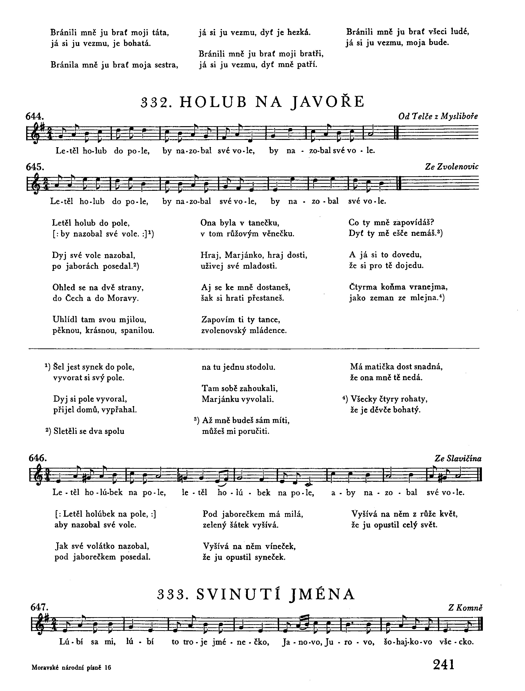Nápěv: č. 15.) Lúbjá sa mi, lúbjá ty ménečka troje, Jurkovo, Jankovo, aj, šuhajko, tvoje. Jurkovo, Jankovo zapšem do lístečka a tvoje, šohajko, do svého srdečka.