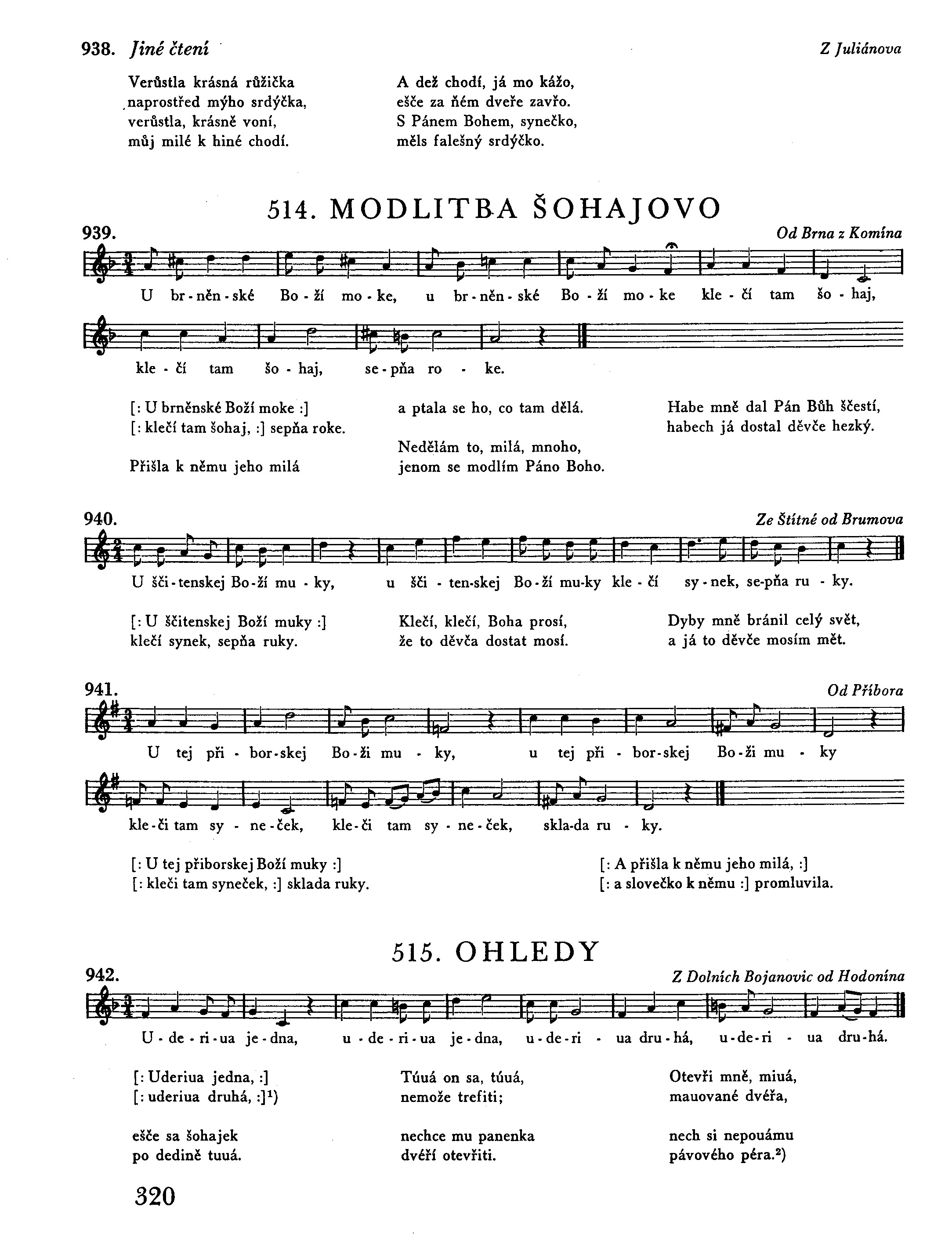 [: U brněnské Boží moke :] [: klečí tam šohaj, :] sepňa roke. Přišla k němu jeho milá a ptala se ho, co tam dělá. Nedělám to, milá, mnoho, jenom se modlím Páno Boho. Habe mně dal Pán Bůh ščestí, habech já dostal děvče hezký.
