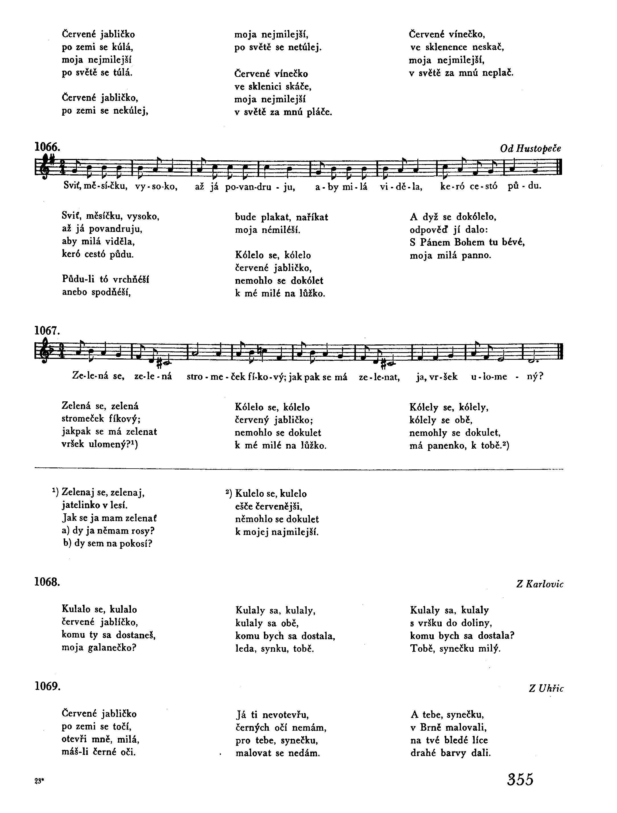 Zelená se, zelená stromeček fíkový; jakpak se má zelenat vršek ulomený?1) Kólelo se, kólelo červený jabličko; nemohlo se dokulet k mé milé na lůžko. Kólely se, kólely, kólely se obě, nemohly se dokulet, má panenko, k tobě.2)