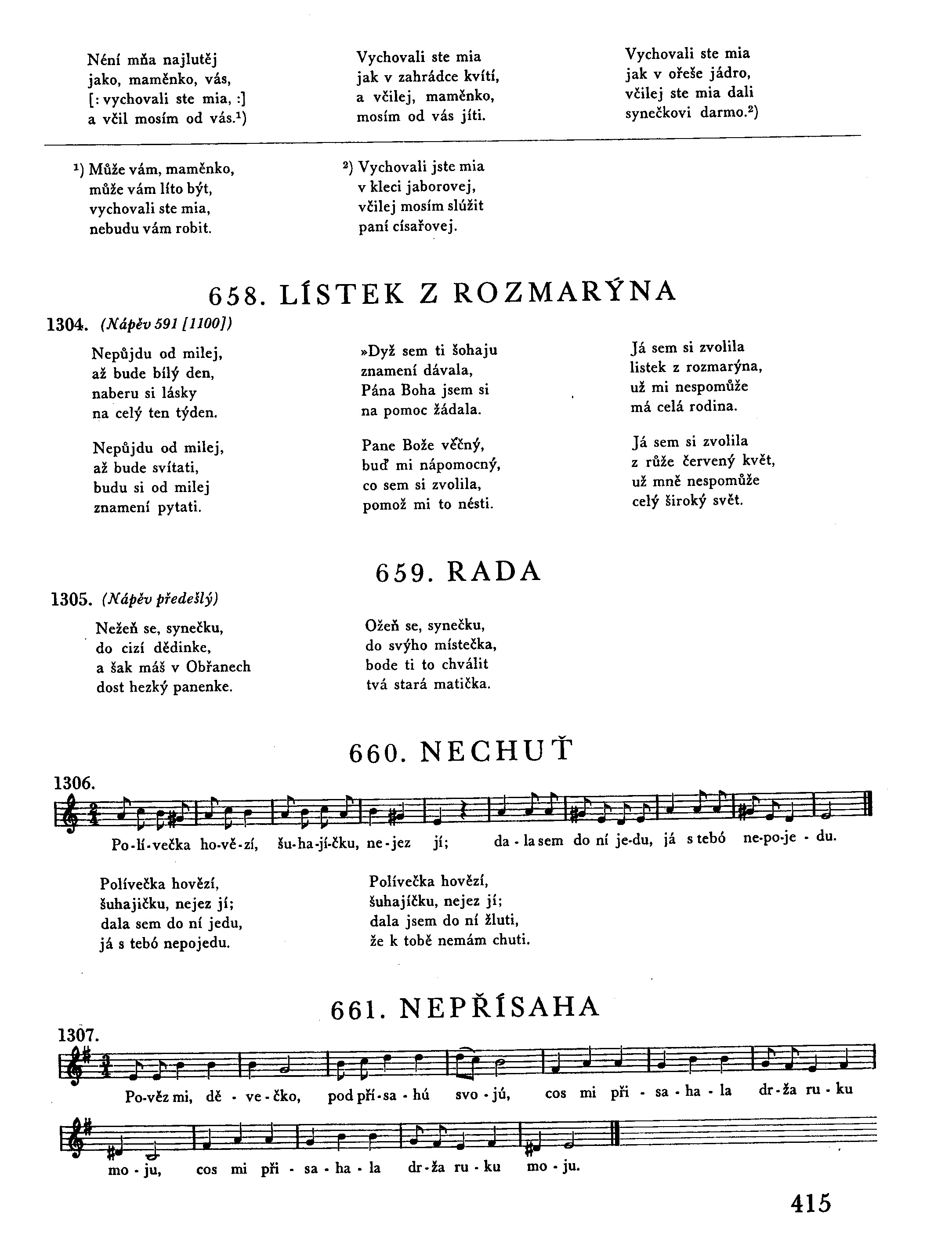 Dybych ja byl malym ptačkem, letaval bych krajem lesem, letěl bych k svej milej, esli ešče žije. Žije, žije, můj synečku, seče v zahradě travičku, seče a vyžina, jak by smutna byla. Co se, mila, na mne hněvaš, že se mnu nic něrozmluvaš? Či je ti co ně v nos, či tva nerozumnosť? Ja se na tebe něhněvam, ale k tobě chuti němam, že ti vaši laju, chceť ti mne nědaju. Ja jsem děvečka chudobna, ja něni sem tobě rovna, ober sobě radši, ktera je bohatši.