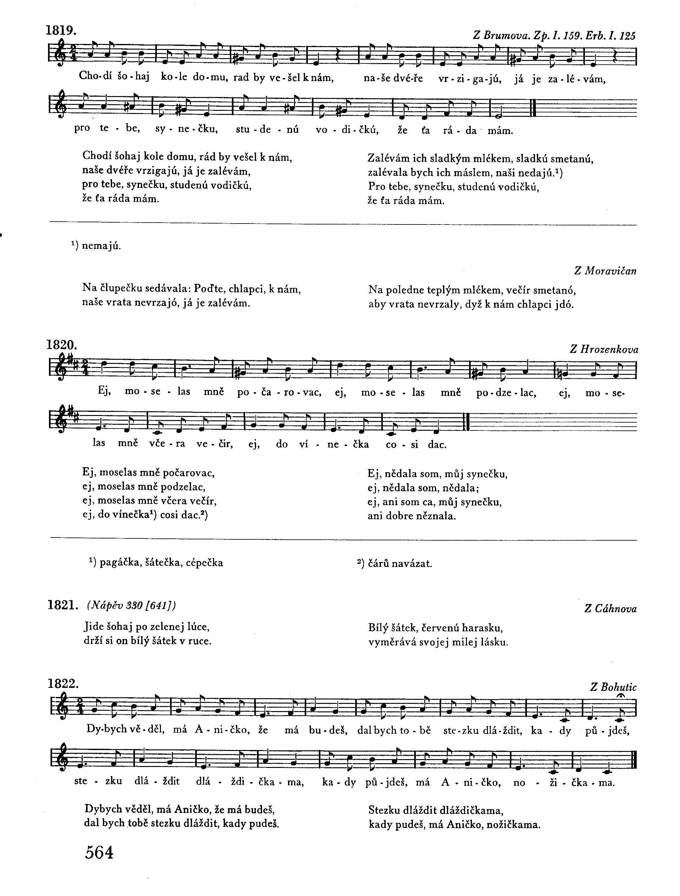 Hezká jsi, Andulko, bejvala, dokud jsi mládenců neznala; jak jsi ty mládence poznala, hned se ti tvá krása změnila. Co je po takové panence, která má tři, čtyry mládence; jednoho v světnici, dva venku: nestojím já o tu panenku! Pěkně mně měsíček svítíval, když jsem od své milé chodíval: svit ty mně, měsíčku, ještě dnes, však mně víc svítívat nebudeš!