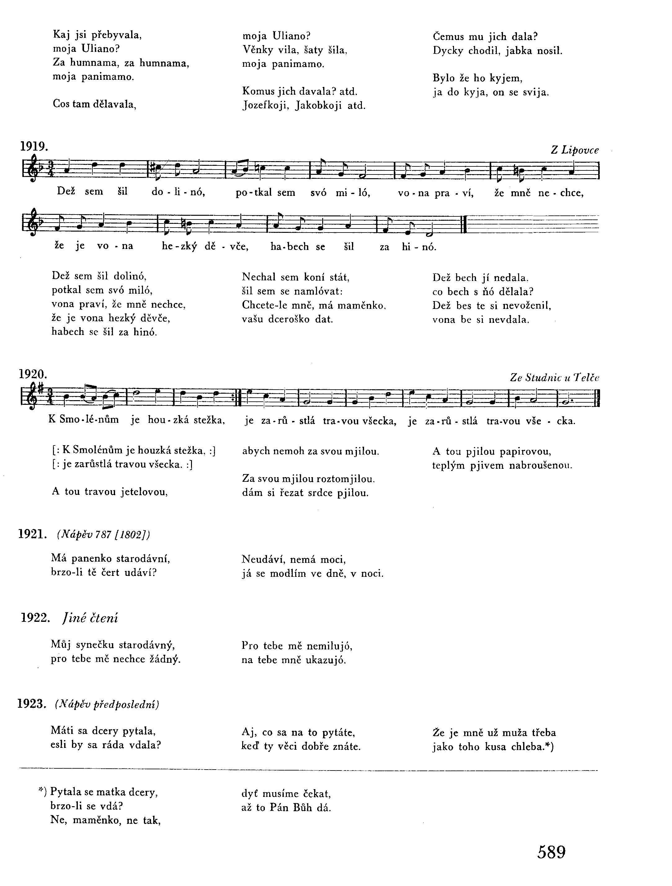 Pročpak plačeš a naříkáš, pro mně tak smutného? Dyj jsi mně nebyla souděná, zvol sobě jiného. A já taky tež tou měrou zvolím sobě jinou, hezkou holku roztomjilou, svému srdci mjilou. Nadala jsi mně falešných, sama’s neupřímná; dalas mi šáteček červený, sama’s mi ho vzala. A kdo jest toho příčina našeho rozvedení? Aby mu Bůh v světě nedal žádný požehnání. Aby naňho dešť nepršel, slunce nesvítilo, aby to lidé věděli, že to pro nás bylo.