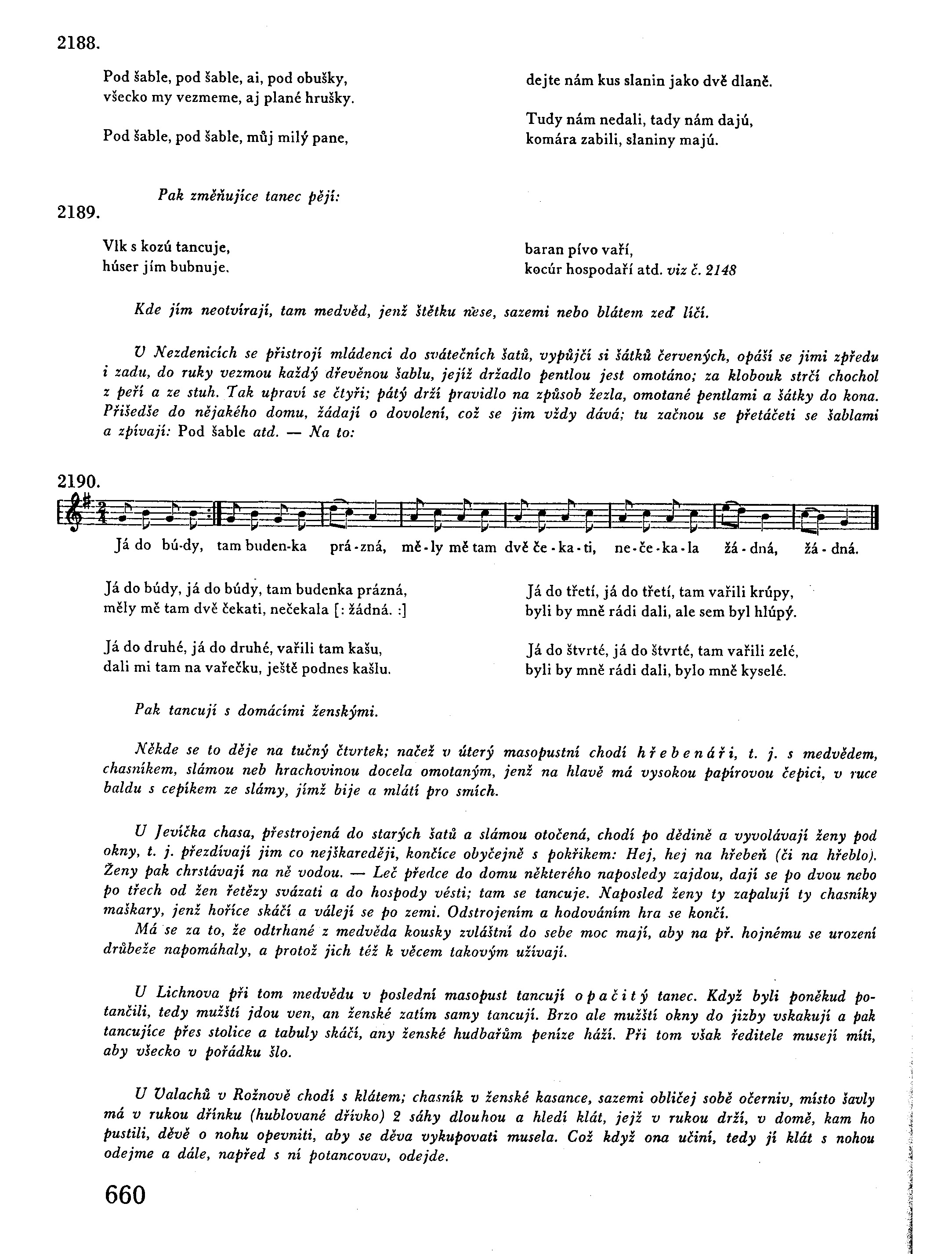 [: Pod našíma vinohrady :] je tam łože s peřinami. [: Na tom łoži šohaj ľeží, :] porubanú hłavu drží. [: Do porúbáł, nech zahójí; :] povezem ho k Majérovi. [: Pan Majér má také masti, :] on zahójí bez boľesti. [: A má, dívča, také zeľé :] co ňa zhójí do neděľe.