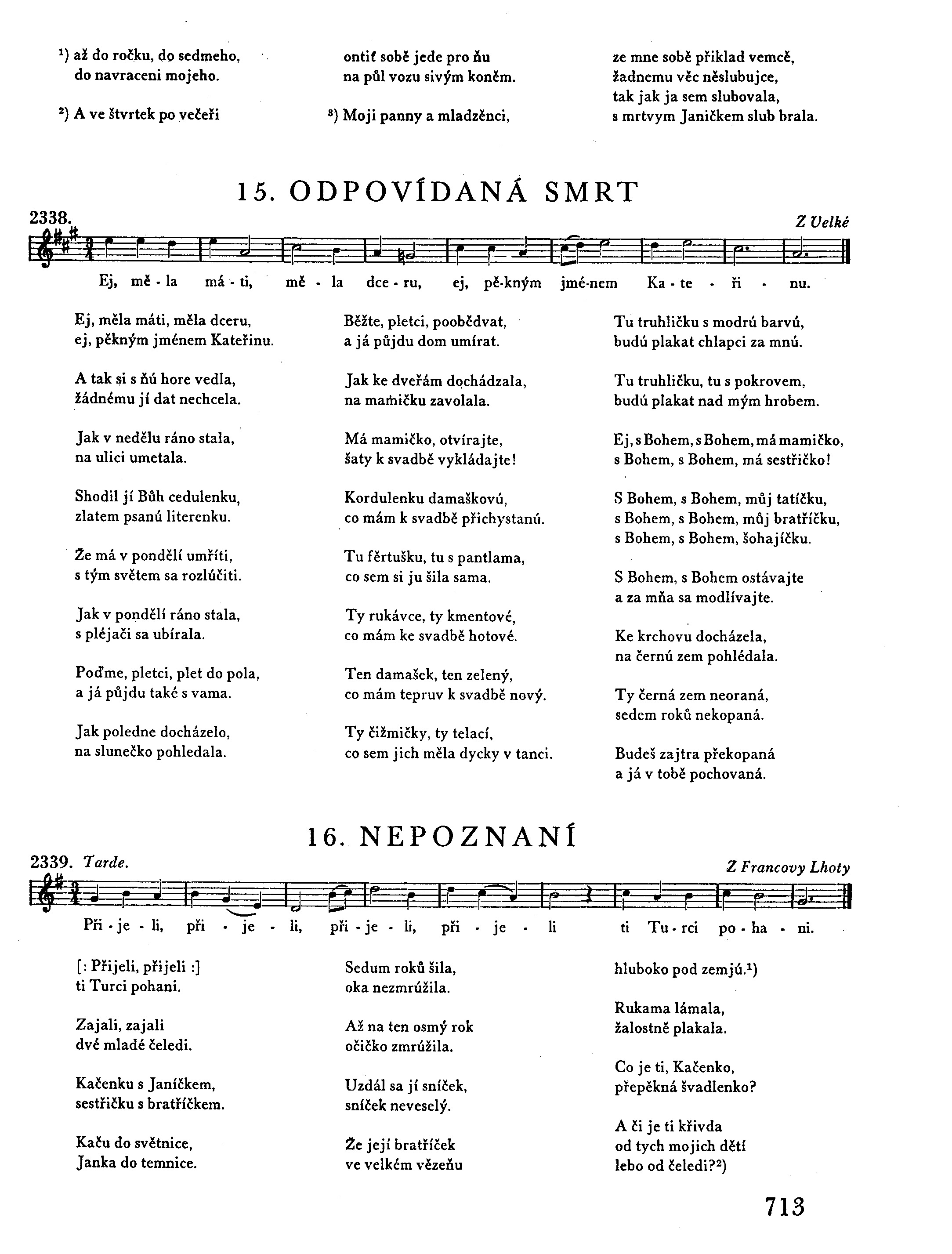 Když sem já šel kolem dvorka, kapaly mě slze z oka. Pověz, synečku rozmilý, co sú tady za noviny? Novinečku uslyšela, padla na zem a omdlela; co sem smutná1) učinila, že sem víneček pozbyla! Neplač, nenaříkej sobě, horší je mně nežli tobě; horší je mně s tým vinečkem2) než tobě s díťátečkem. A ty chováš, až3) vychováš, vychovaja na vojnu dáš, já se stále trápit musím,4) vzal sem si vínek na svú duši.5) Dyž já přijdu před boží súd, bude mi hořký vínek tvůj,6) zažnú mně svíce pod koleny pro tvůj víneček zelený. Ešče temu horší zažnú, co má v domě svoju ženu7) a se s jinýma zabývá, ten hřích odpuščen nebývá.