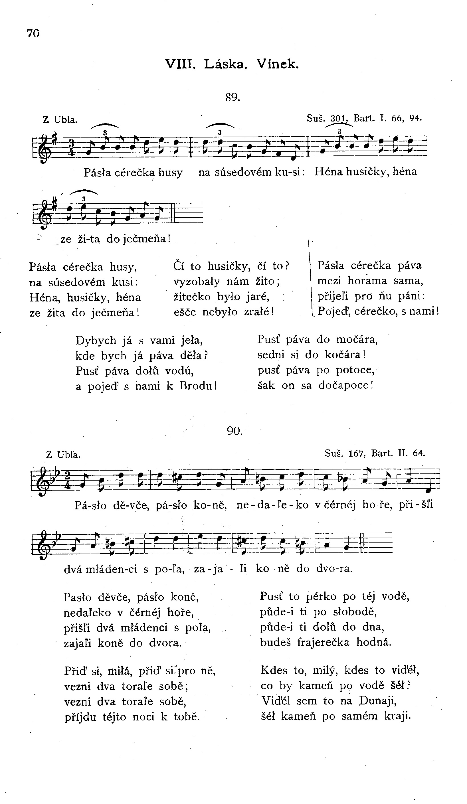 1. Ach neraz sem já, neraz ja přes ten ľesek přełáz, požčaj, miľunká, koňa, už ňa nožičky boľá.*) 2. Ach husičky, husičky, ja nekaľte vodičky, přijede tu syneček napájati koníčky. 3. Maľučká chvíľka do dňa, má miłá, vyprovoď ňa. Což bych ťa provázeła, nejsu já tvoja miłá. (Erben 113 a 132, Kollár I. 180) 4. Čí to husičky, čí to vyzobały nám žito, vyzobały nám jarku v stodoľe na hambáłku. (Erben 364, Sušil str. 298.)
