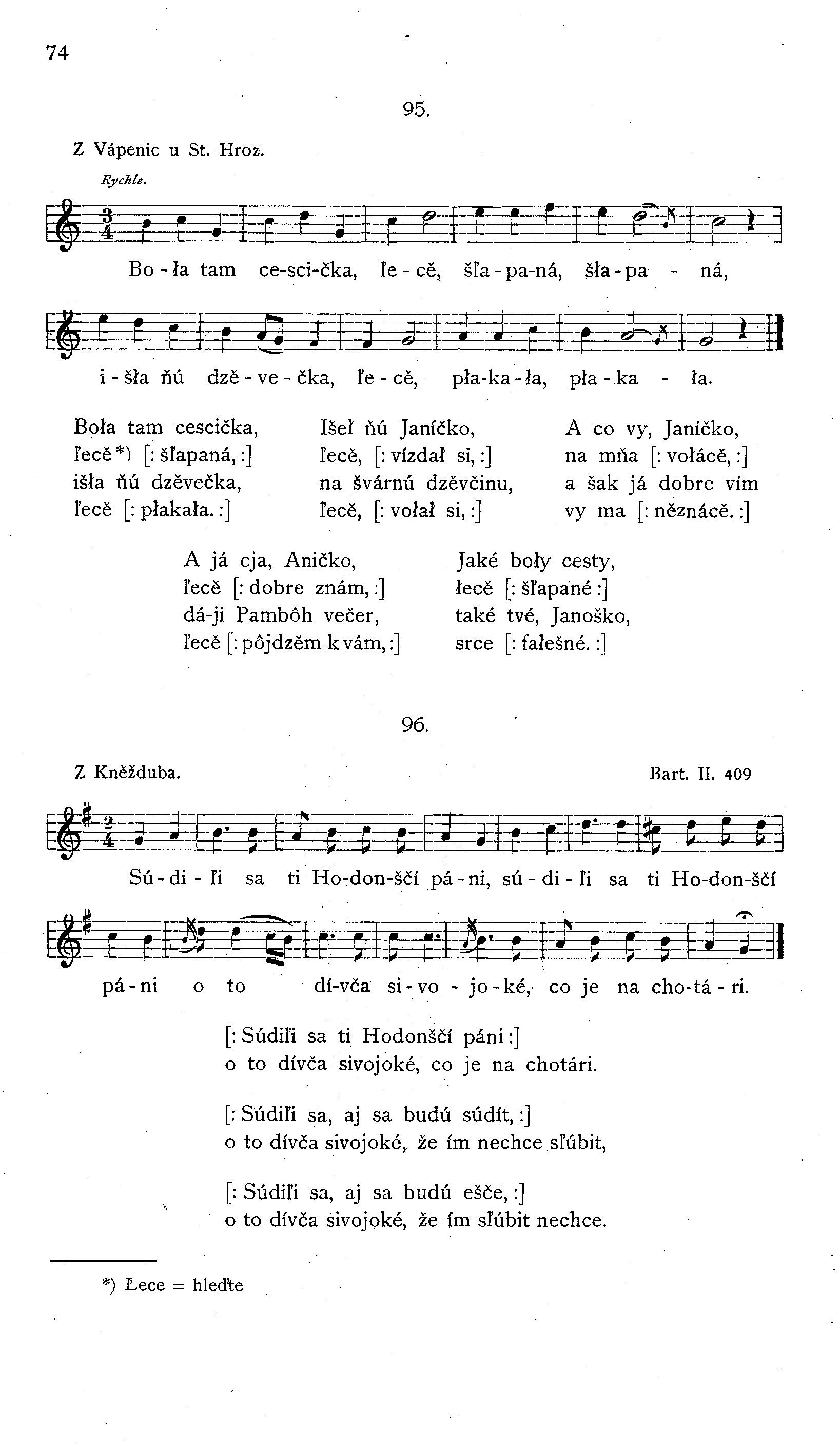 Boła tam cescička, ľecě*) [: šľapaná, :] išła ňú dzěvečka, ľecě [: płakała. :] Išeł ňú Janíčko, ľecě, [: vízdał si, :] na švárnú dzěvčinu ľecě, [: vołał si. :] A co vy, Janíčko, na mňa [: vołácě, :] a šak já dobre vím vy ma [: něznácě. :] A já cja, Aničko, ľecě [: dobre znám, :] dá-ji Pambôh večer, lecě [: pôjdzěm k vám. :] Jaké boły cesty, ľecě [: šľapané :] také tvé, Janoško, srce [: fałešné. :]
