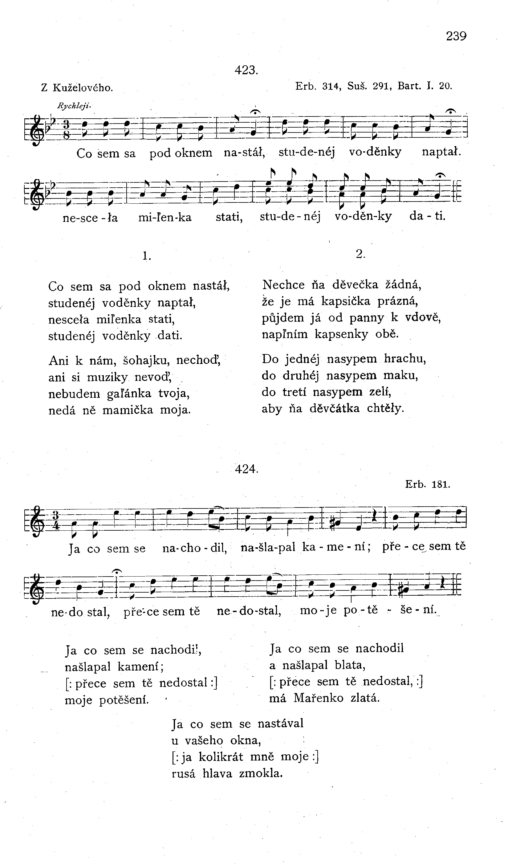 Široky, hluboky ty Vltavsky tůně: měl jsem já panenku, teď mi srdce stůně. Měl jsem já panenku, měl jsem ji dvě léta: teď mi ji odvedli – po lásce je veta. Co jsem se nachodil, co našlapal bláta: přec jsem tě nedostal, má panenko zlatá! Co jsem se nachodil, našlapal kamení: přec jsem tě nedostal, moje potěšení!