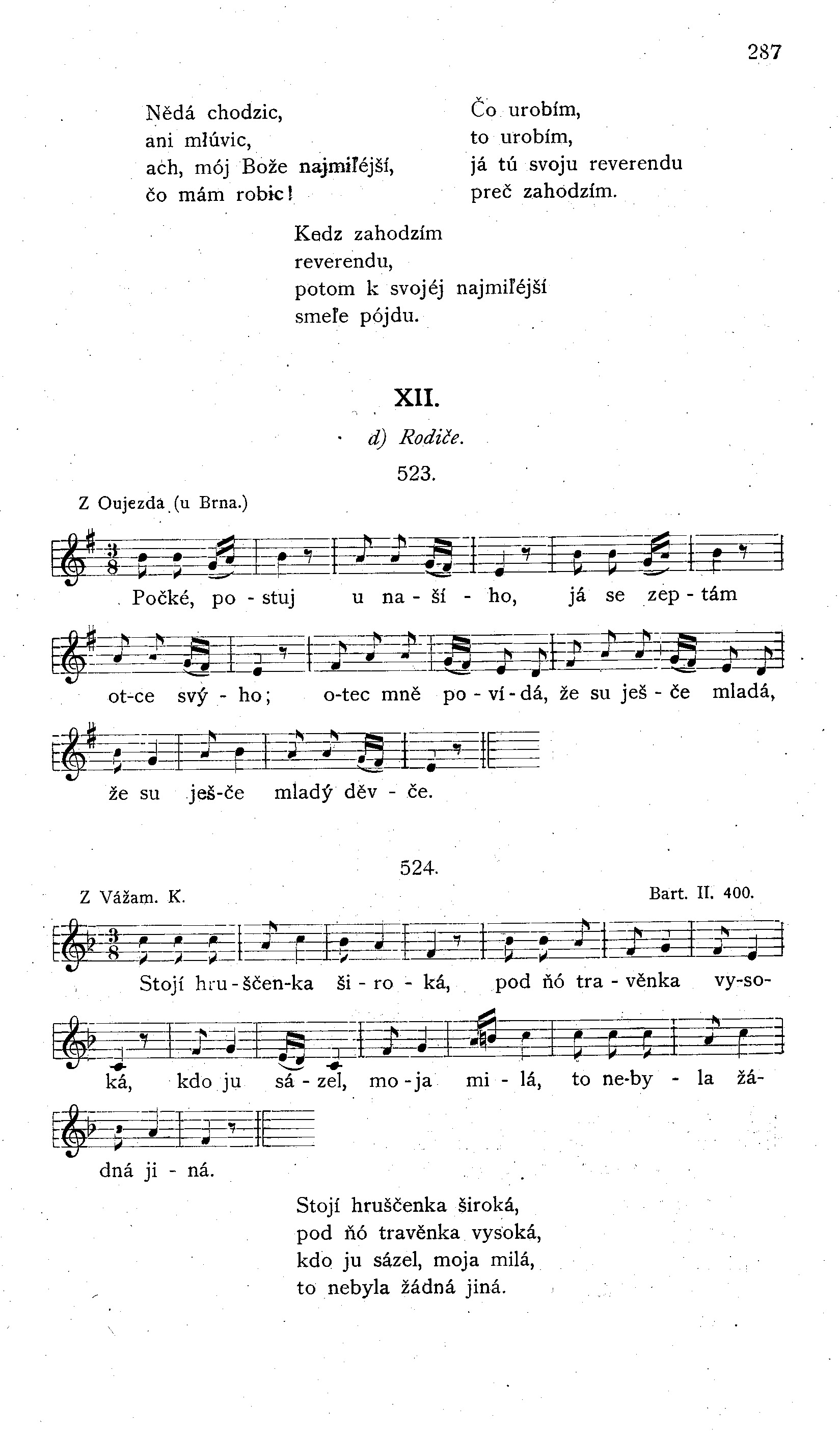Stojí hruščenka široká, pod ňó travěnka vysoká, kdo ju sázel, moja milá, to nebyla žádná jiná. Stojí hruščenka na poli šerší u vrchu než v důli: Poď, má milá, vyprovoď mně, juž je malá chvílka do dně. Nesmím tě vyprovoditi, zbraňuje mně otec máti, zbraňujó mně převelice, nechcó dovolit do konce.