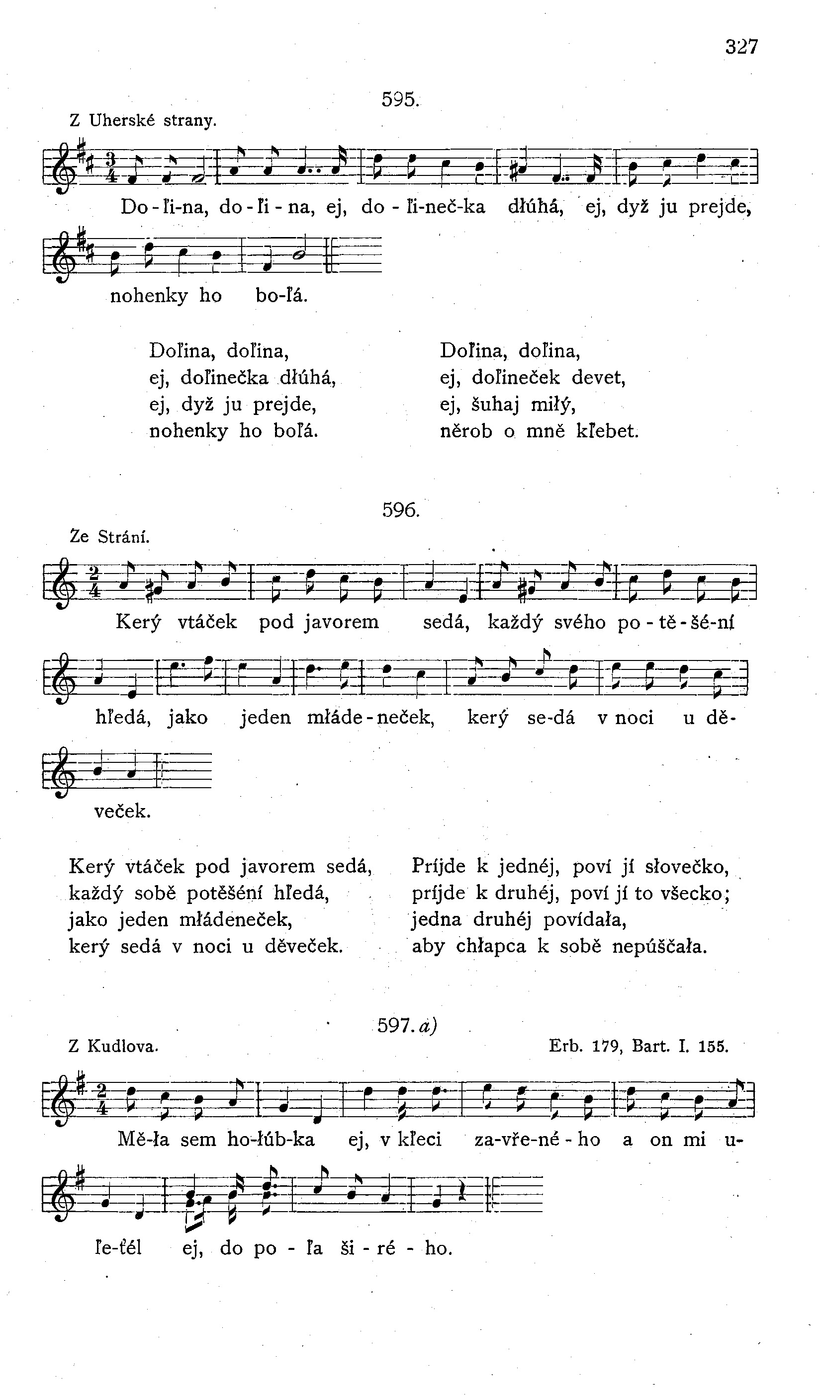 Aj doľina, doľina, małá doľinečka, [: já bych tam nebývała, :] dyby ne synečka. Aj doľina, doľina, małá doľinečko, [: och po ní sa prochází :] potěšéní šecko. Ne tak potěšéní, aľe mé myšľéní, [: była łáska była, :] aľe už jí néni.