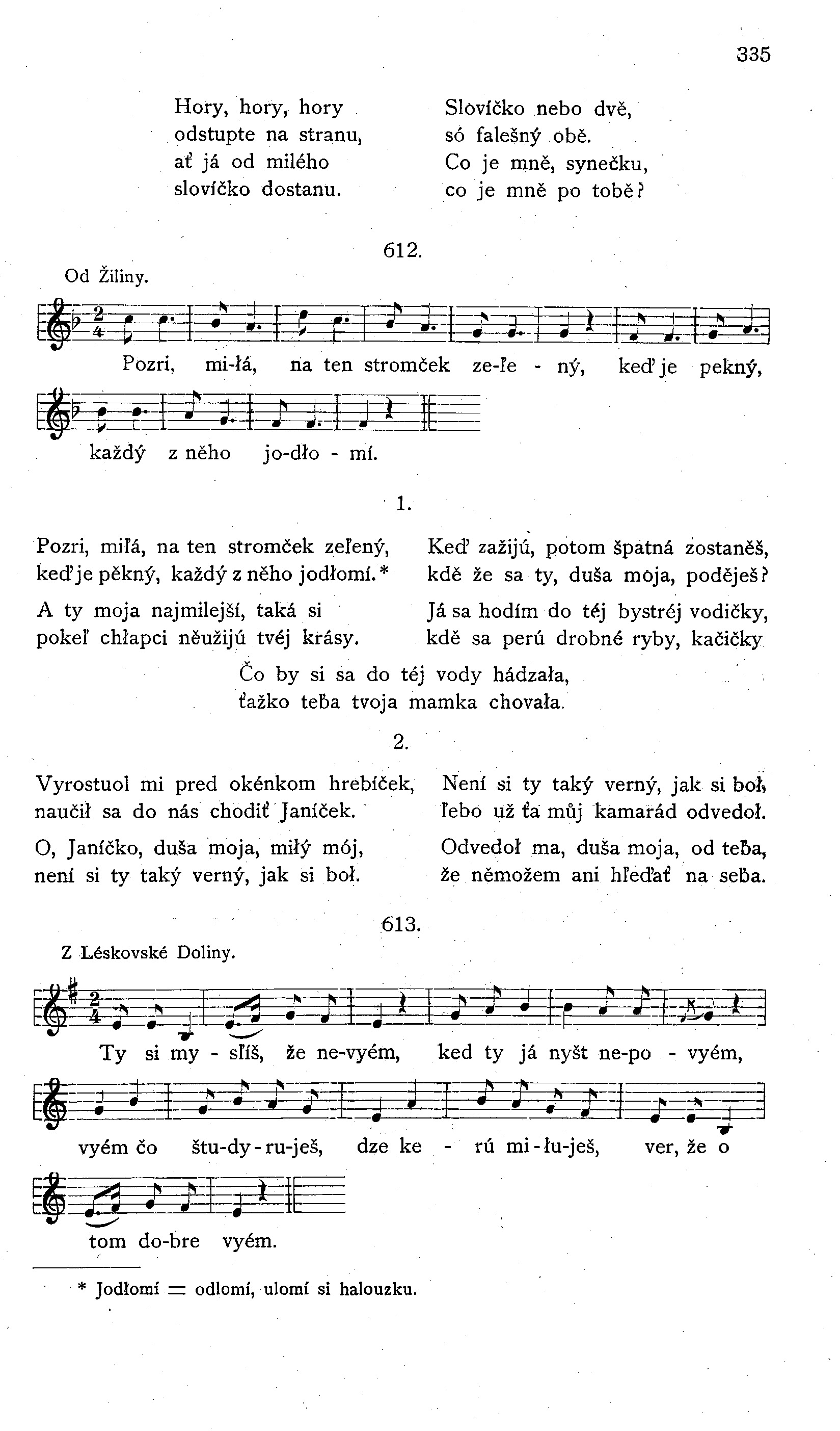 Boła tam cescička, ľecě*) [: šľapaná, :] išła ňú dzěvečka, ľecě [: płakała. :] Išeł ňú Janíčko, ľecě, [: vízdał si, :] na švárnú dzěvčinu ľecě, [: vołał si. :] A co vy, Janíčko, na mňa [: vołácě, :] a šak já dobre vím vy ma [: něznácě. :] A já cja, Aničko, ľecě [: dobre znám, :] dá-ji Pambôh večer, lecě [: pôjdzěm k vám. :] Jaké boły cesty, ľecě [: šľapané :] také tvé, Janoško, srce [: fałešné. :]