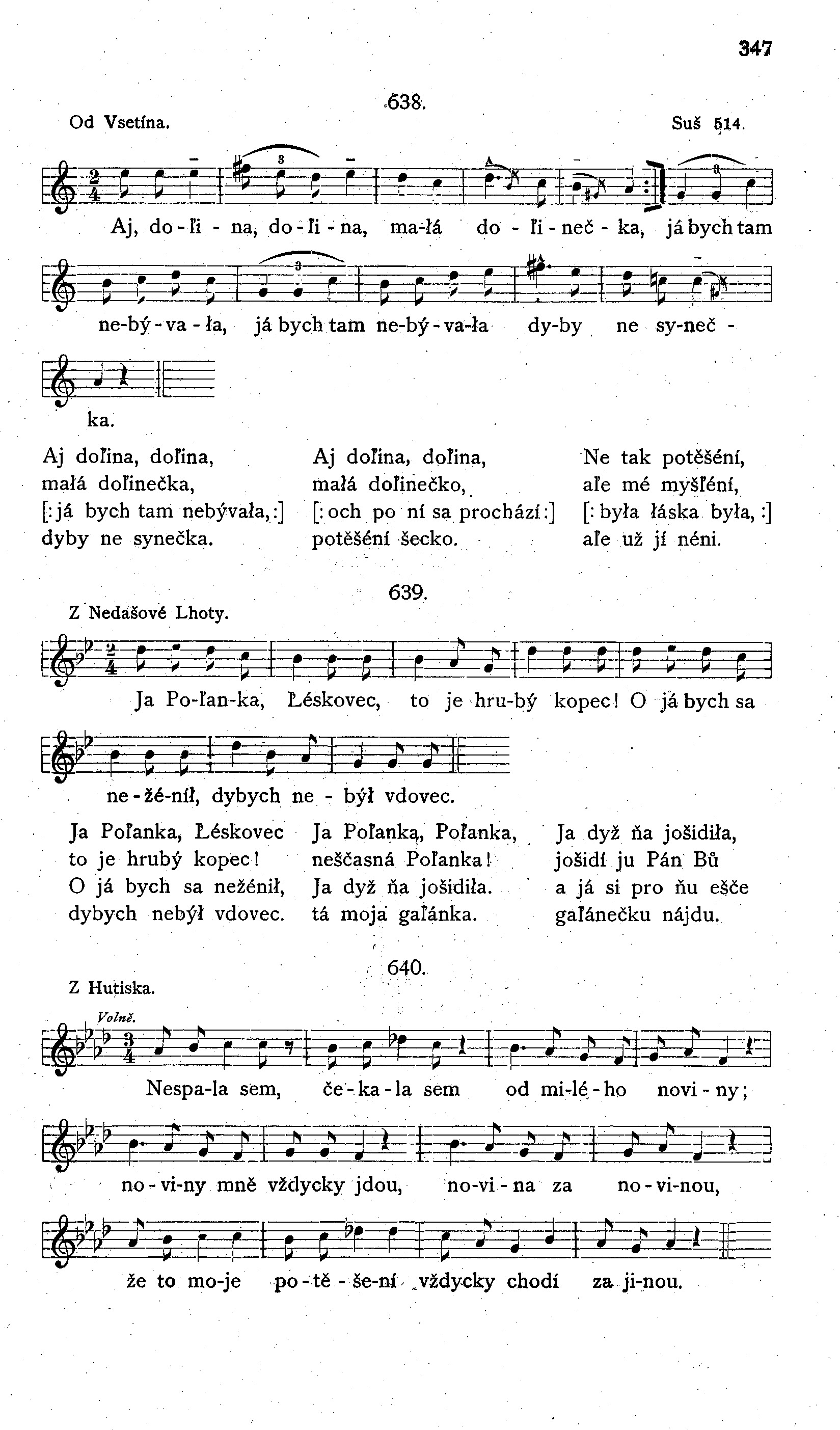 Aj doľina, doľina, małá doľinečka, [: já bych tam nebývała, :] dyby ne synečka. Aj doľina, doľina, małá doľinečko, [: och po ní sa prochází :] potěšéní šecko. Ne tak potěšéní, aľe mé myšľéní, [: była łáska była, :] aľe už jí néni.