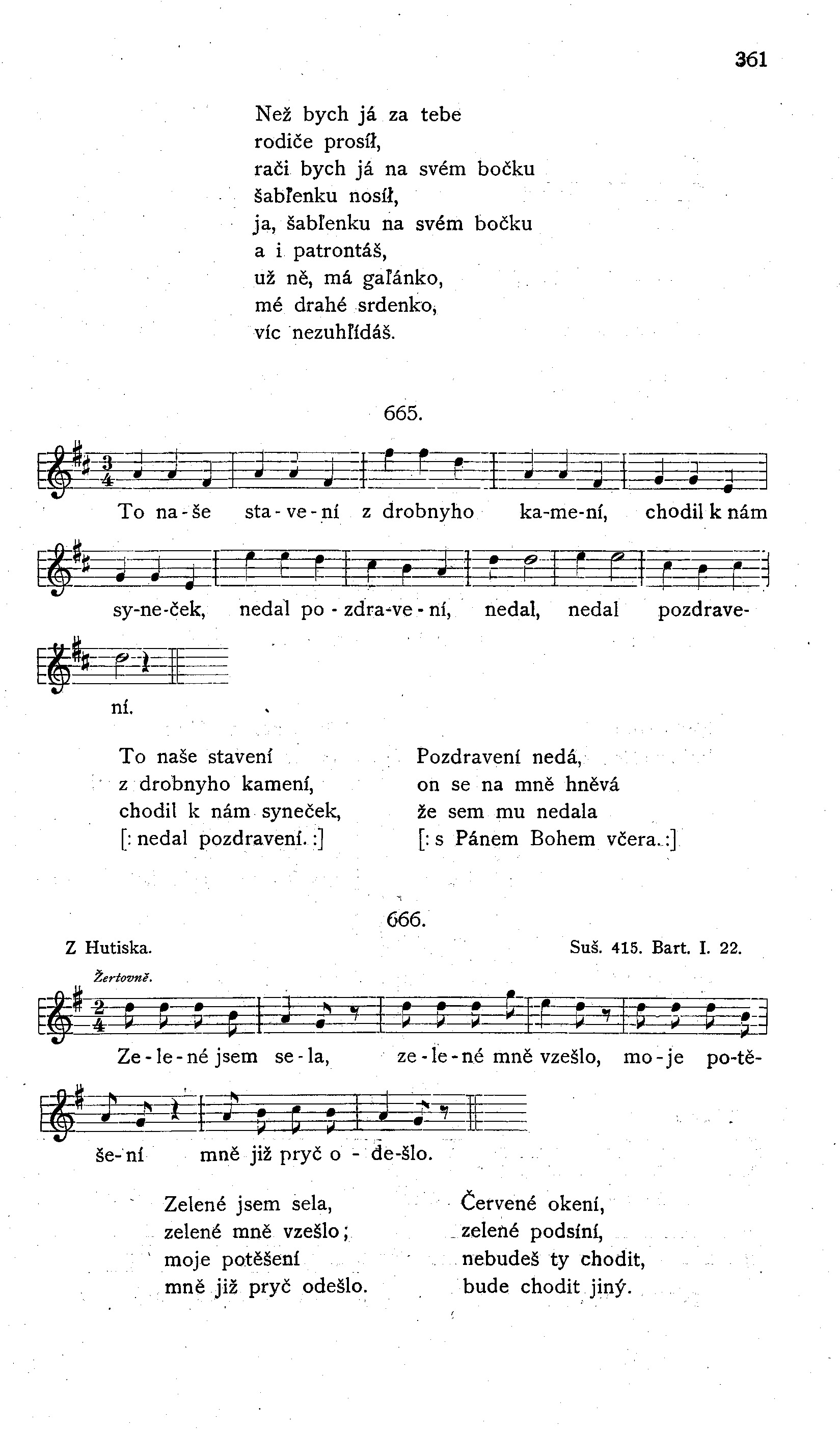 Zelene sem sela, zelene mi zešlo. Žaden člověk něvi, [: po kem je mi teskno. :] Teskno je mi, teskno bez meho mileho, že něvim cestečky do krajiny jeho. Dybych ja věděla cestečku k milemu, poslala bych ja tam pisemečko k němu.1) Ach, vim ja cestečku, ale že je bludna, nědošla by ja tam do třetiho tydňa. Do tydňa třetiho, do dňa devateho, že něvim cestečky do krajiny jeho. Dala bych pozdraviť na stokrát mileho.