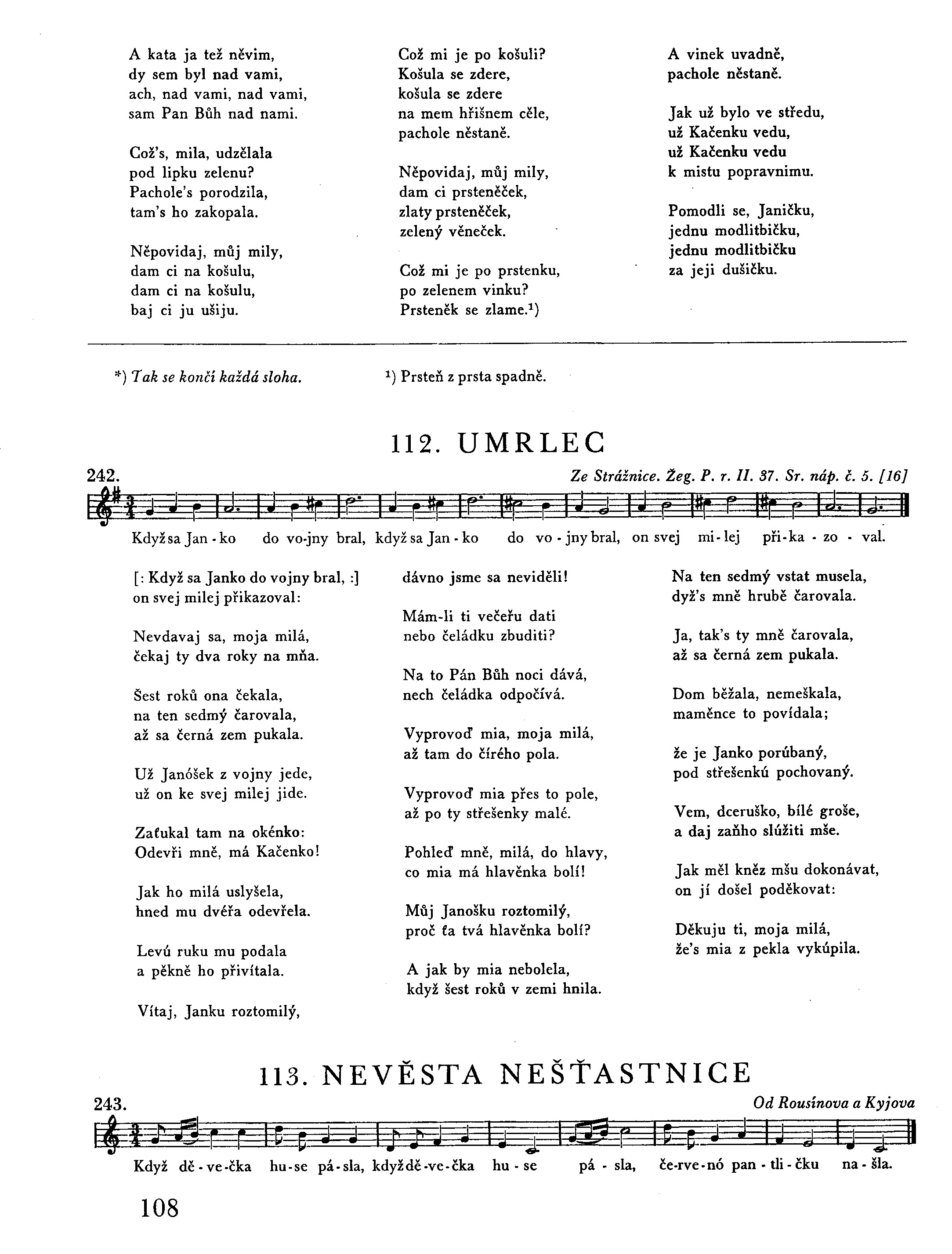 [:Na mšu svatú zvonijú, :] [: panenky se strojijú. :] Všecky idú pod věnci a za nimi mládenci. Jenom jedna nebyla, pro věnec se vrátila.1) Do zahrady vkročila, tři růžečky utrhla. Tři růžečky utrhla, tři věnečky uvila. První vínek zavíjá, kněz mšu svatú začíná. Druhý vínek zavíjá, kněz svůj kalich pozvíhá. Třetí vínek zavíjá, kněz mšu svatú zavírá. Do kostela běžela, mšu svatú omeškala. Potkal tě ju jeden pán, a to byl ten ďábel sám.2) Kam, děvečko, kam ideš, do kostela nepřindeš. Du, pane, do kostela. — Mšu svatú sem zmeškala? Mšu svatú si zmeškala, kázání neslyšela. Skoč, děvečko, na kamen a z kamena na třemen. A z třemena na můj kůň, pojedeme na hrad můj. Pojedeme do pola, kde’s jak živa nebyla. Ke kostelom přijeli, zdaleka vyhýbali. K šibenicám přijeli, zdaleka se klaňali. Co to, pane, děláte, kostelom vyhýbáte? Kostelom vyhýbáte, šibenicám se klaňáte? To jsú naše kostely, by ste hřišní věděli. A kdy k peklu přijeli, na dveře udeřili. Otevřte, tovaryši, vezem vám tělo i duši. Postavte jí stolicu, dejte jí vína sklenicu. Ponýprv se napila, modrý plamen pustila. Po druhé se napila, červený plamen pustila. Po třetí se napila, bílý plamýnek pustila. Otevřte okynečko, ať si ochladím srdýčko. »Kdy si chtěla chladiti, měla’s dobře činiti.« Kdo je tady z Moravy, od mamulky z tej strany? Zkažte tam mé mateři, ať mě nečeká k večeři. Ani zítra k obědu, že už já věc nedondu. Ješče jednu dceru má, ať jí vůle nedává, jako mně ju dávala; kam sem se smutná dostala! Proč, zvony, nezvoníte, snad už o mně nevíte? Jak ti máme zvoniti? Nechtěla’s nás slyšeti. Kohúti nezpíváte, snad už o mně nedbáte? Jak ti máme zpívati? Nechtěla’s nám sypati.
