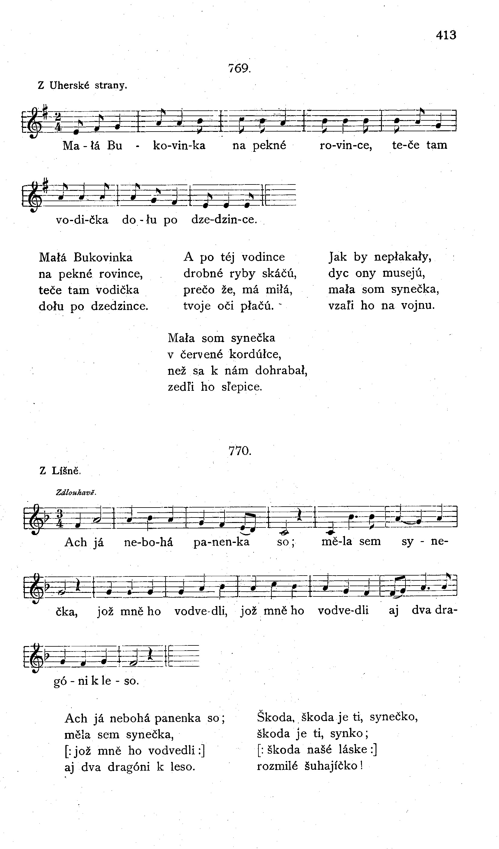 Małá Bukovinka na pekné rovince, teče tam vodička dołu po dzedzince. A po téj vodince drobné ryby skáču, prečo že, má miłá, tvoje oči płačú. Jak by nepłakały, dyc ony musejú, mała som synečka, vzaľi ho na vojnu. Mała som synečka v červené kordúłce, než sa k nám dohrabał, zedľi ho sľepice.