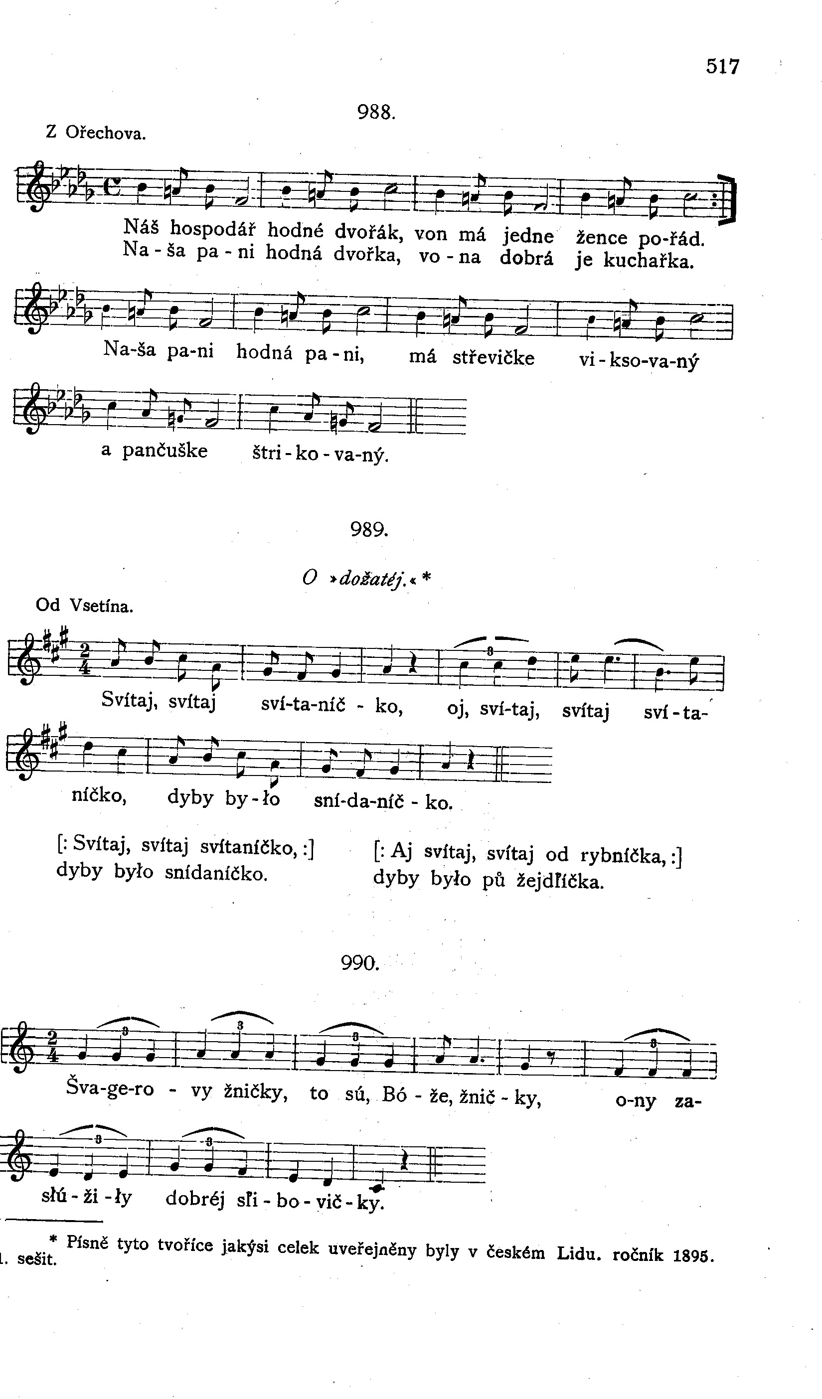 Náš hospodář hodné dvořák, von má jedne žence pořád. Naša pani hodná dvořka, vona dobrá je kuchařka. Naša pani hodná pani, má střevičke viksovaný a pančuške štrikovaný.