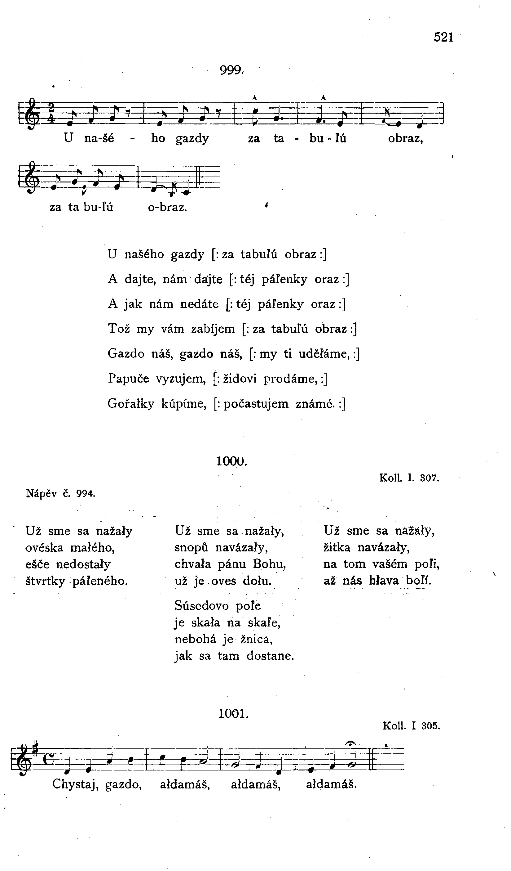 U našého gazdy [: za tabuľú obraz :] A dajte, nám dajte [: téj páľenky oraz :] A jak nám nedáte [: téj páľenky oraz :] Tož my vám zabíjem [: za tabuľú obraz :] Gazdo náš, gazdo náš, [: my ti uděłáme, :] Papuče vyzujem, [: židovi prodáme, :] Gořaľky kúpíme, [: počastujem známé. :]