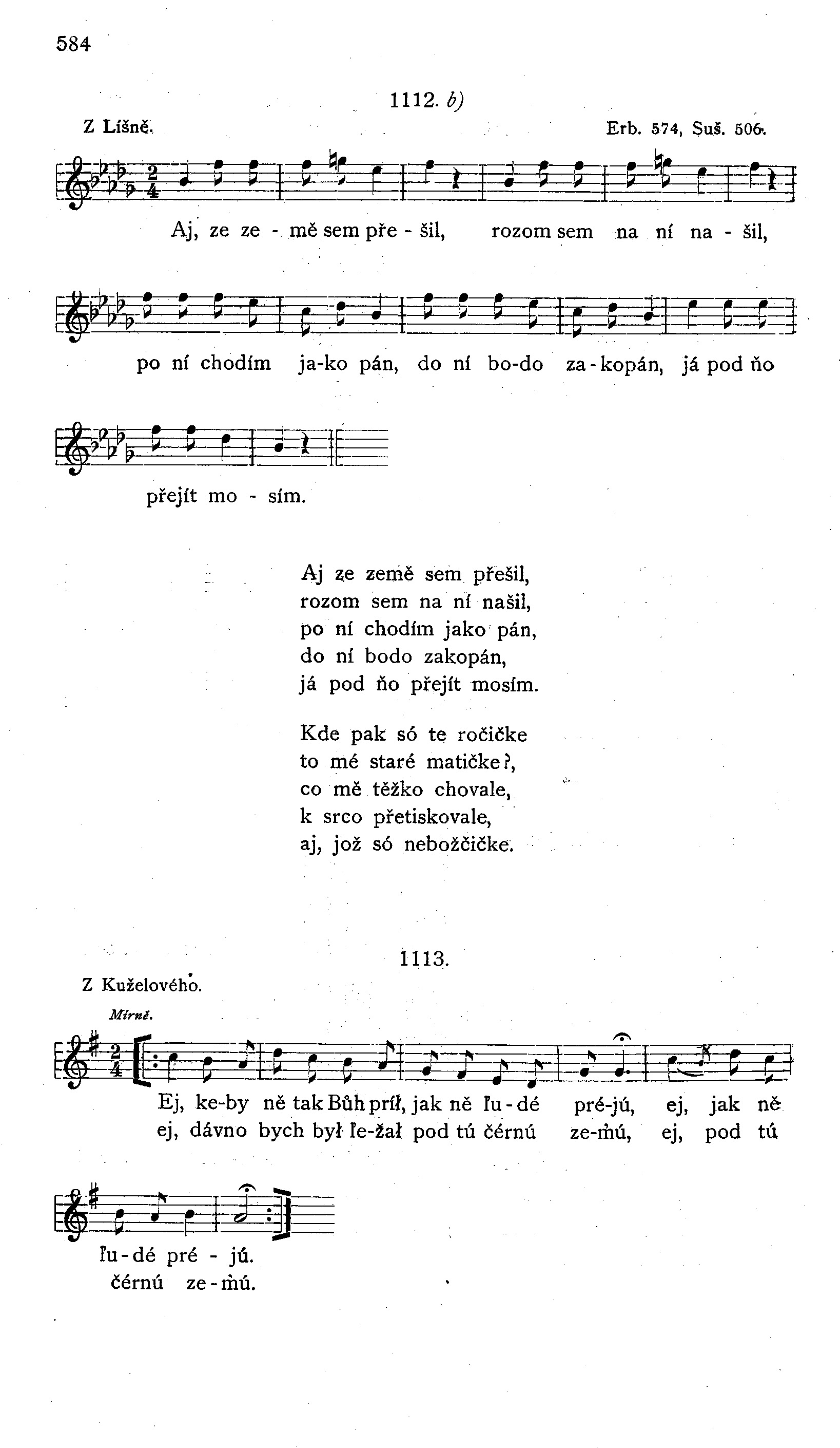 Vyšla děvčina, vyšla jediná jak růžový květ, stála ona, stála, hořce zaplakala, změnil sa jí svět. Čeho ty plačeš, čeho naříkáš, děvčino moja? Jak já nemám puakat, jak nemám naříkat, nebudu tvoja. Ach, nepuač, nepuač a nenaříkaj, šak ty budeš má, ludé ťi mia přejú a celá rodina a Pán Bůh to dá. [: Ty budeš paní :] na velkém dvoře, a já budu pánem, při svém táboře,1) Ty půjdeš cestú a já hostýncem, ty budeš pannú a já mládencem. Ty půjdeš horú a já dolinú, ty zakvitneš růž a já kalinú. Až my umřeme, zkážeme sobě zlaté litery vybit na hrobě. Kdo to přečítá, spomene sobě, neskončená láska leží v tem hrobě.