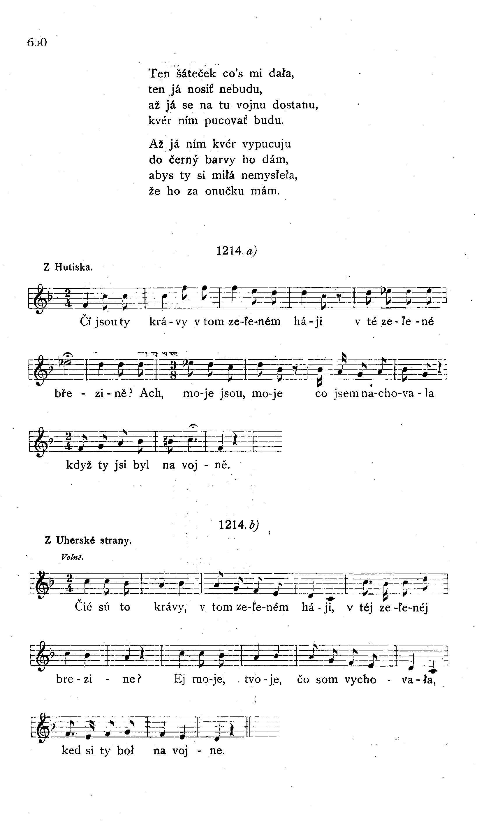 Čí jsou ty krávy v tom zeľeném háji v té zeľené březině? Ach, moje jsou, moje co jsem nachovala když ty jsi byl na vojně.